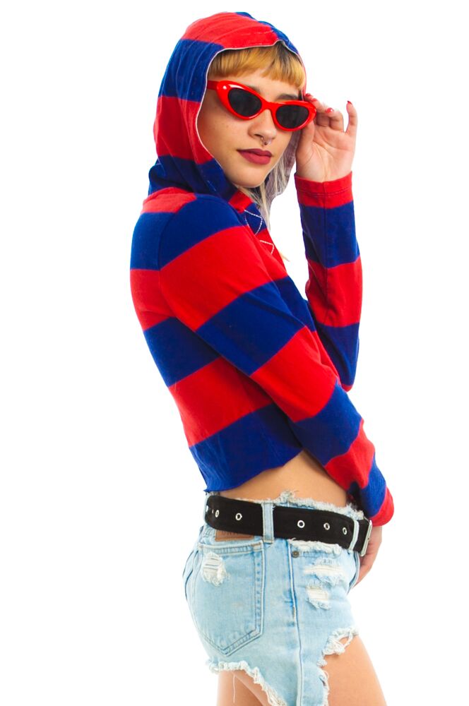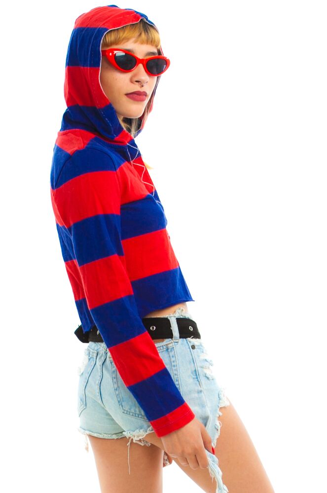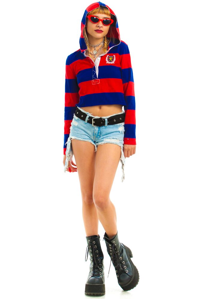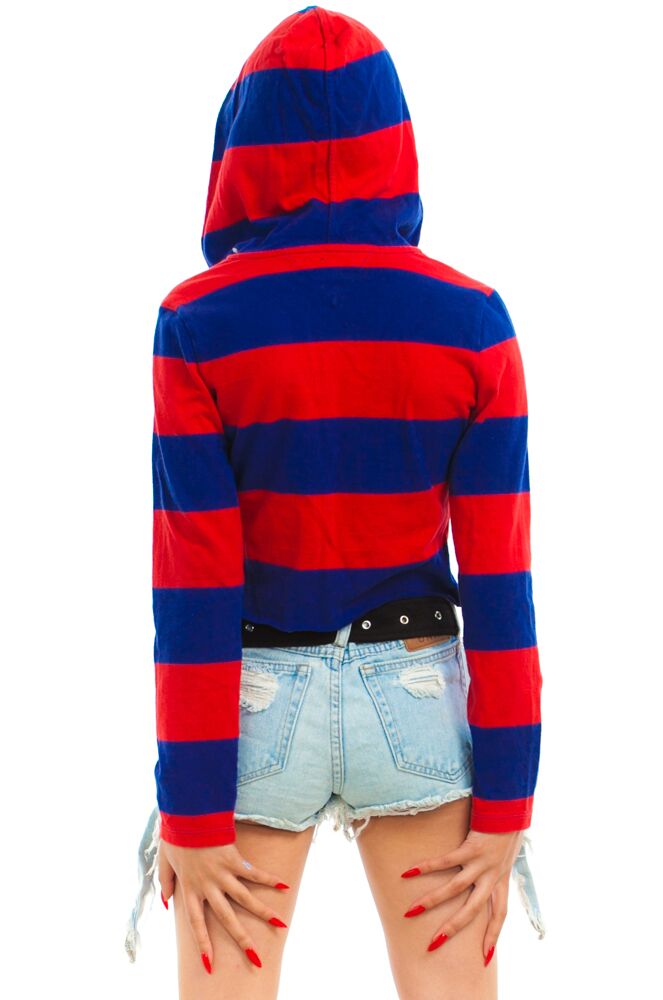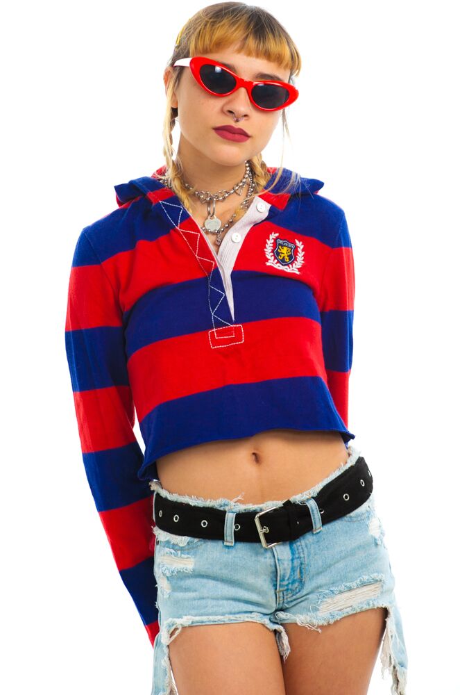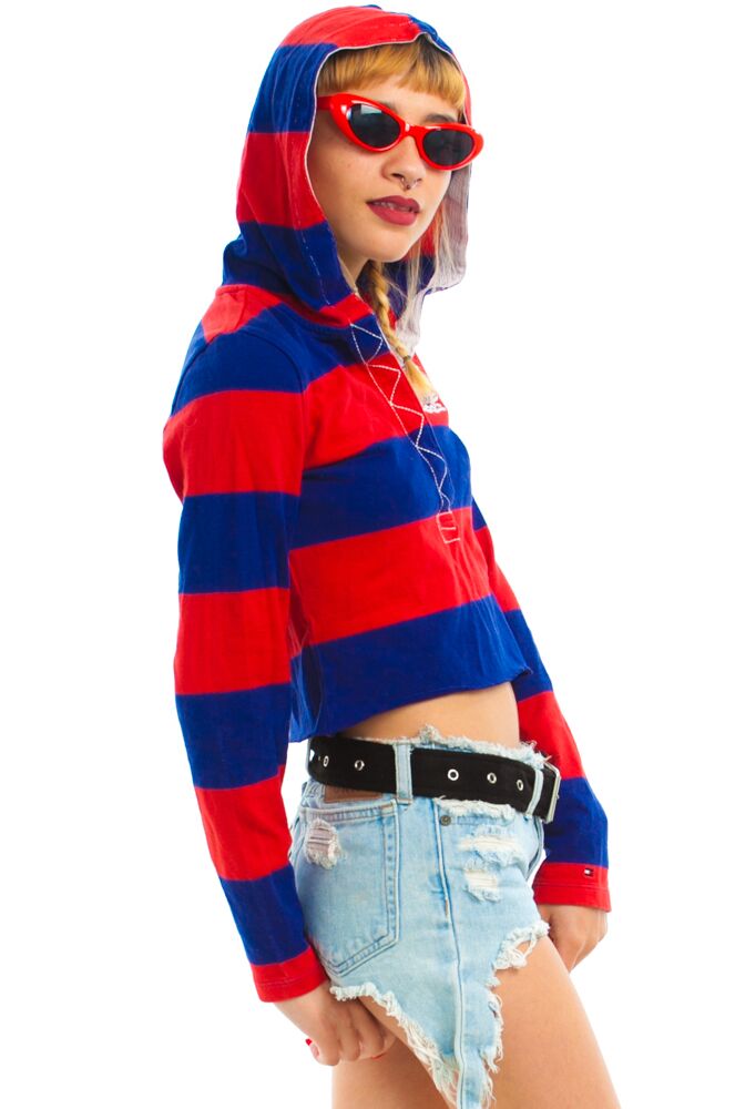 Cropped, striped, red and blue longsleever. Features buttons at the chest and a sparkly embroidered Hilfiger patch.