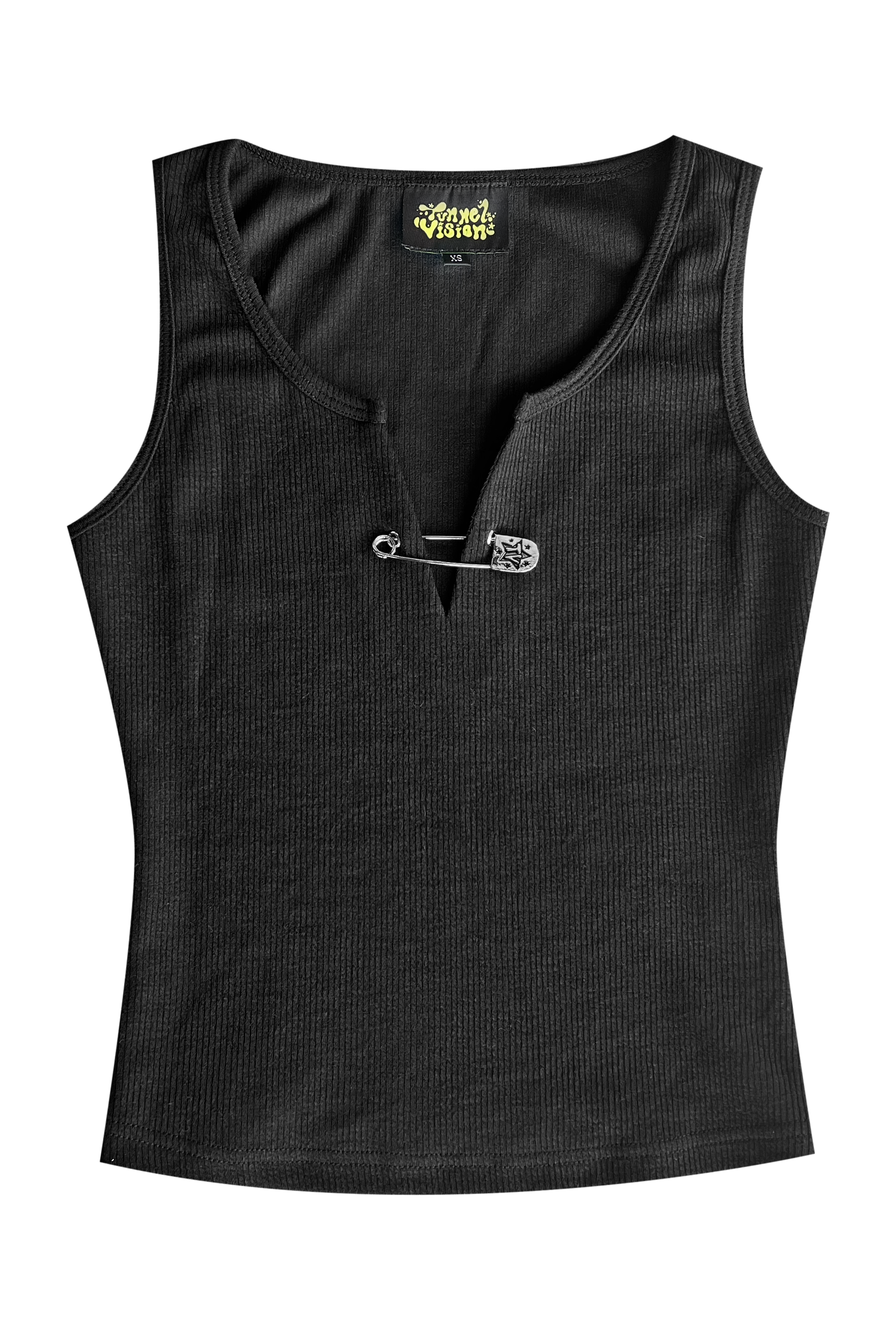 Super comfy stretch rib knit tank top with jumbo custom functional Tunnel Vision safety pin at neckline! SUPER comfy!