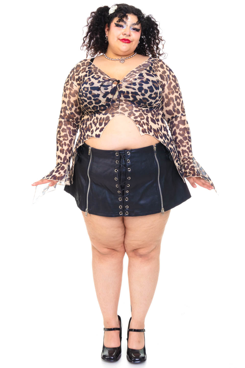 Our model Bella is 5'6" and has a 42" waist, 52" hips, and 43" chest; they usually wear a size 2X/3X and are pictured in a size 3X.