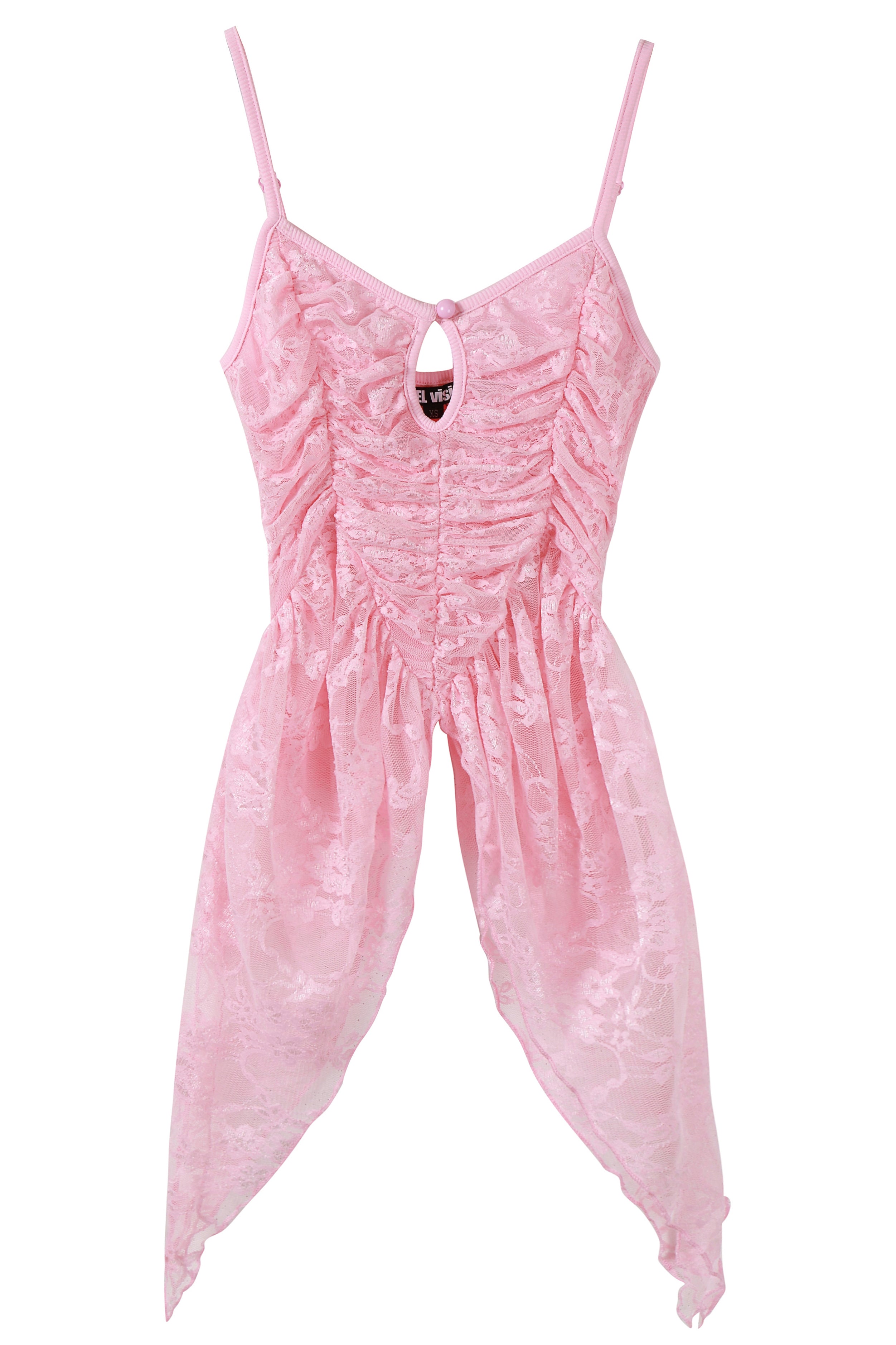 Ruched top with keyhole neckline, adjustable straps, and asymmetric longline fit.