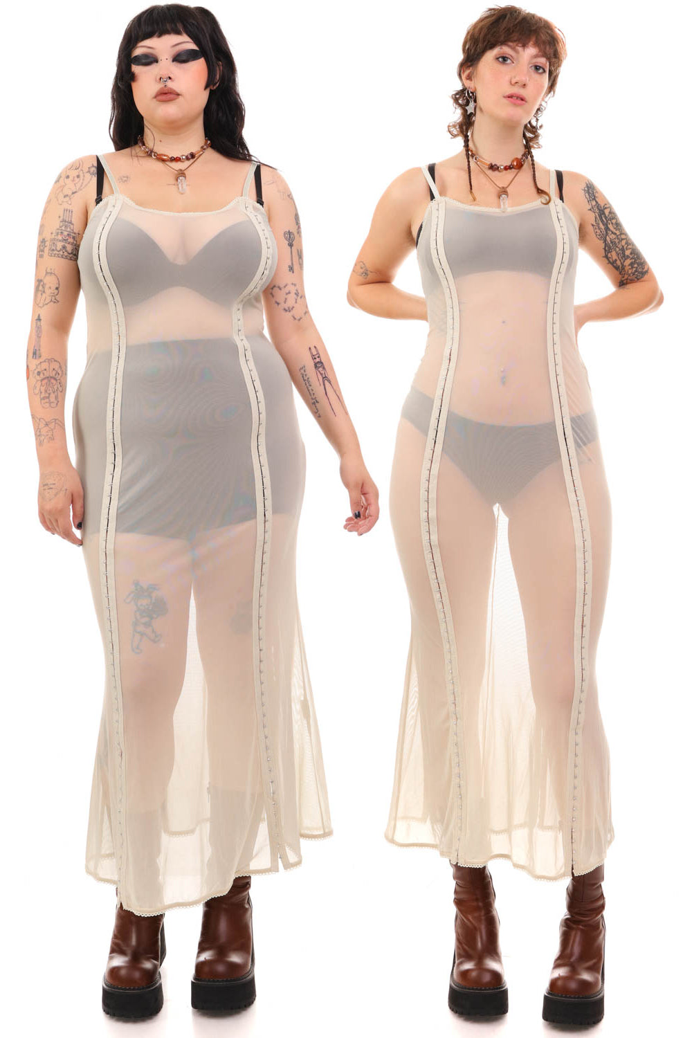 Stretch sheer mesh maxi dress with functional hook and eye closures up front and back! Unhook whichever you choose to create different silhouettes!