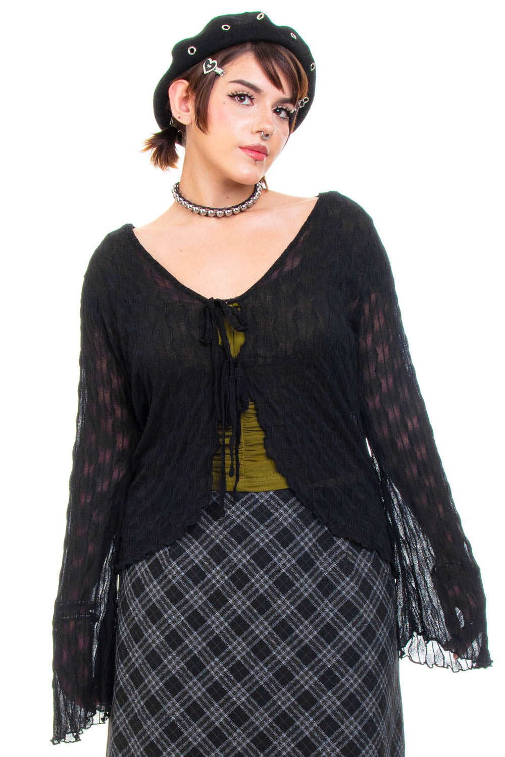 Super adorable black mesh long-sleeve with front tie closure and flutter witchy sleeves!
