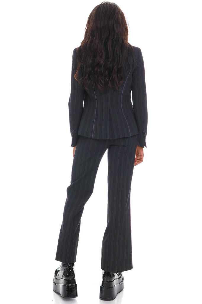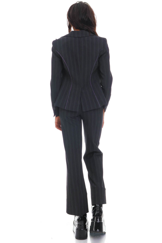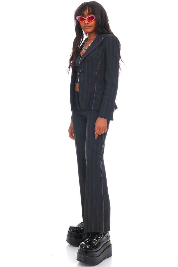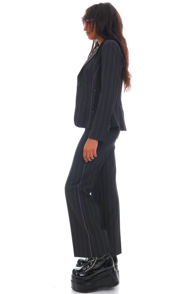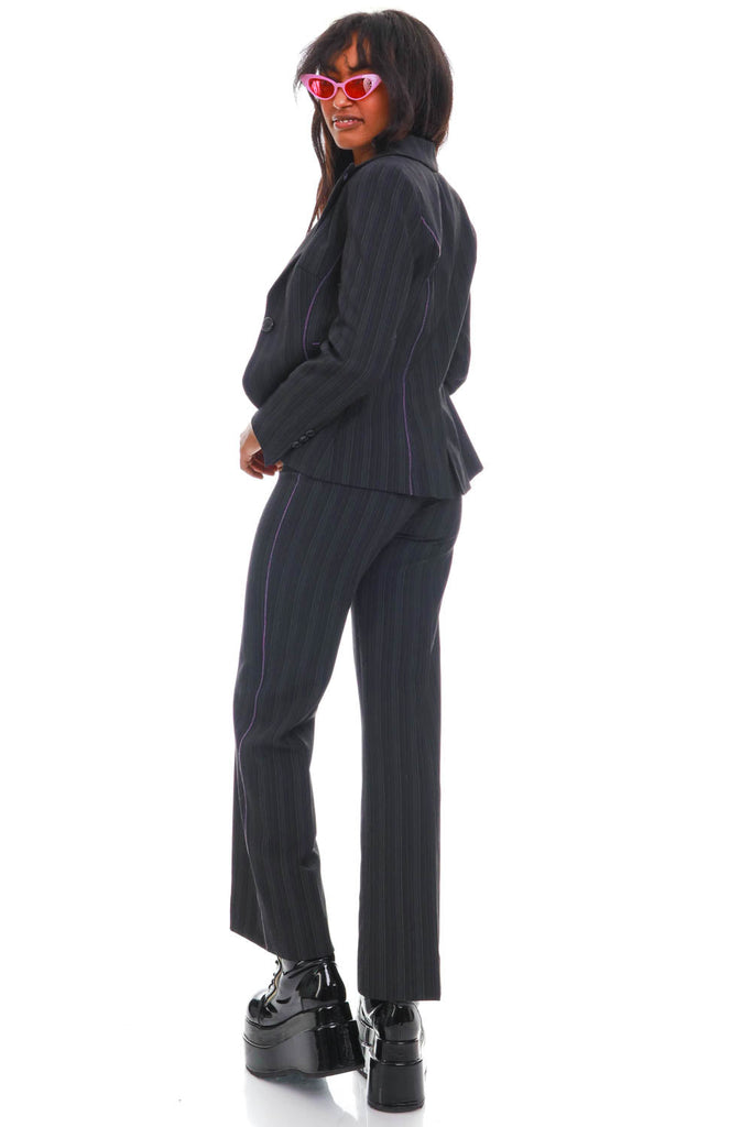 Vintage 90's black, grey, pink striped suit by iconic brand Bebe adorable fitted silhouette with faux pockets and front button closure! Low rise flares pants with a front button zipper closure!