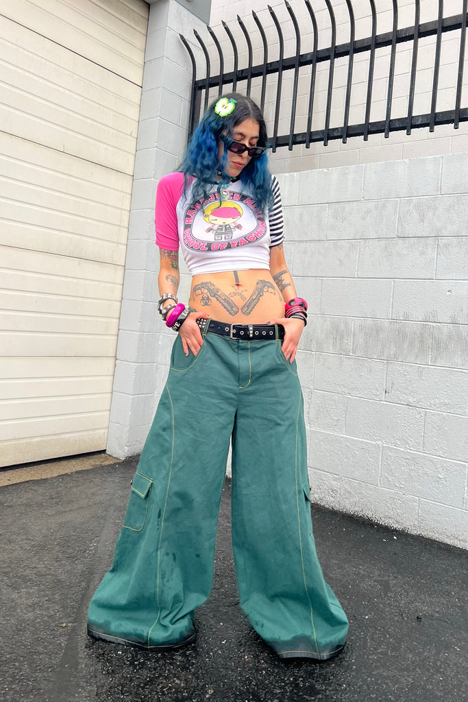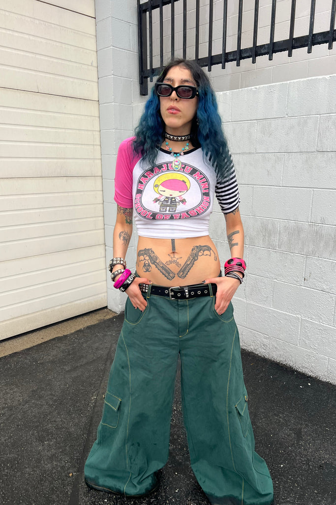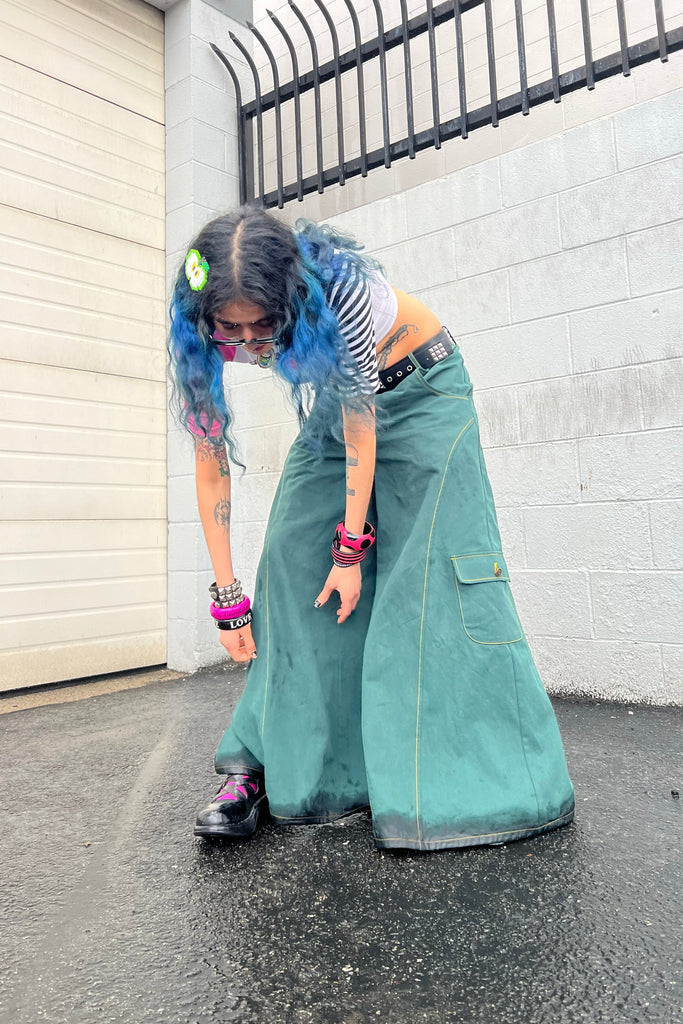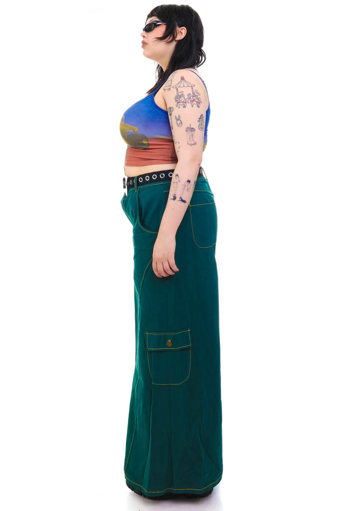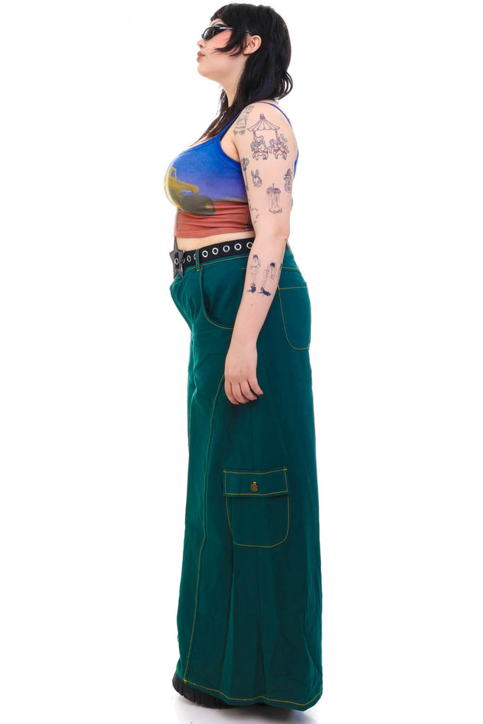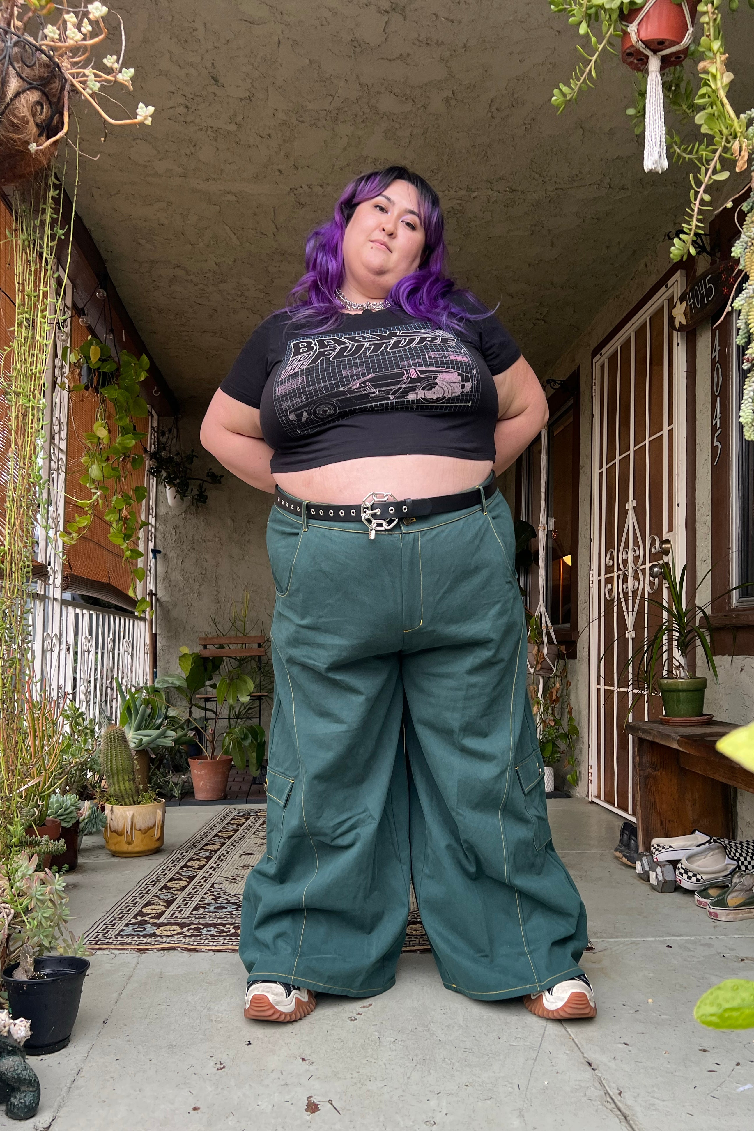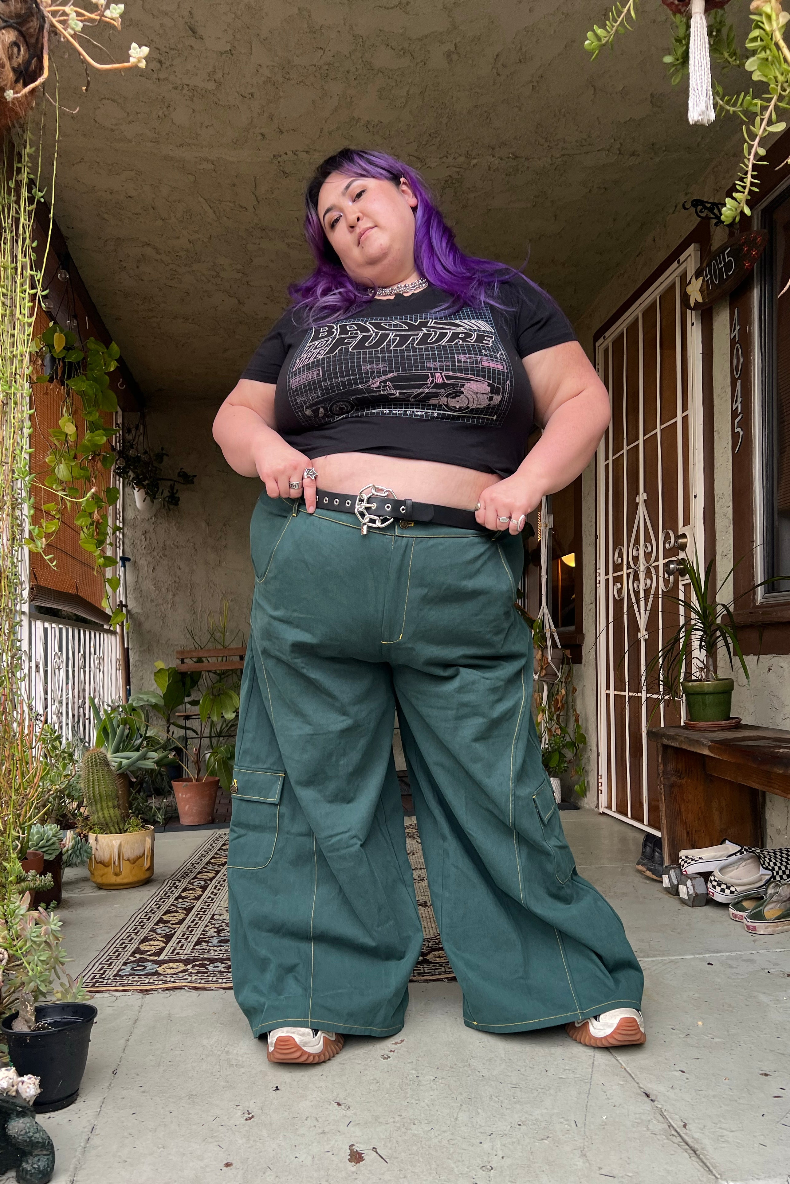 This item was designed to fit low rise and baggy, true Y2K style! There is a little bit of stretch at the waistband due to the bias cut.