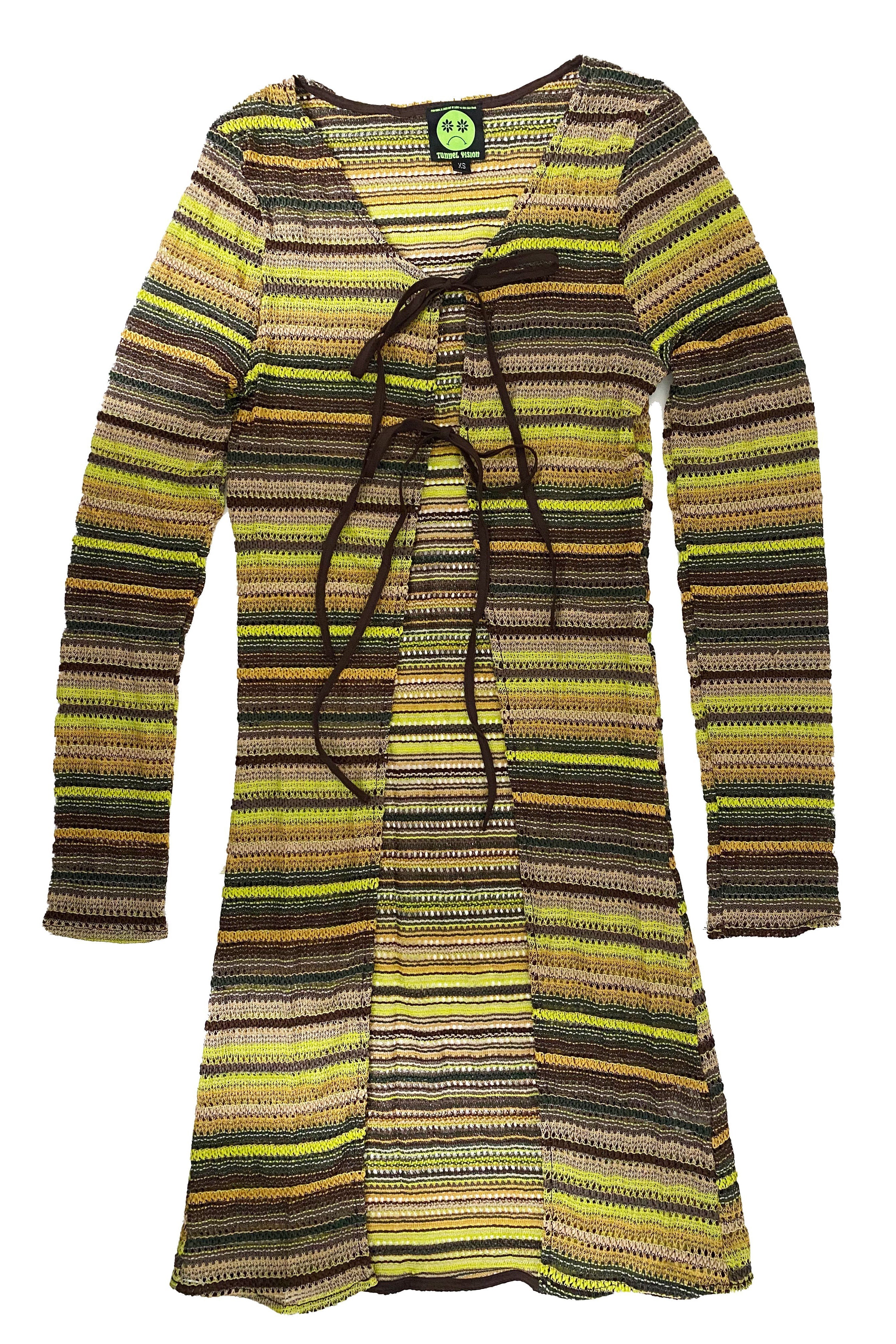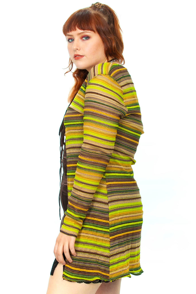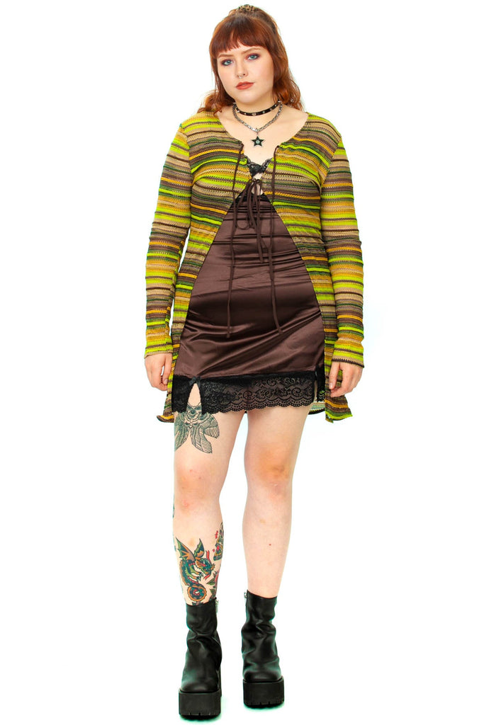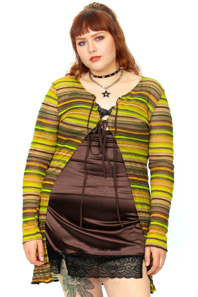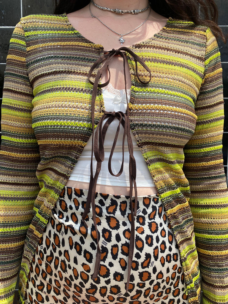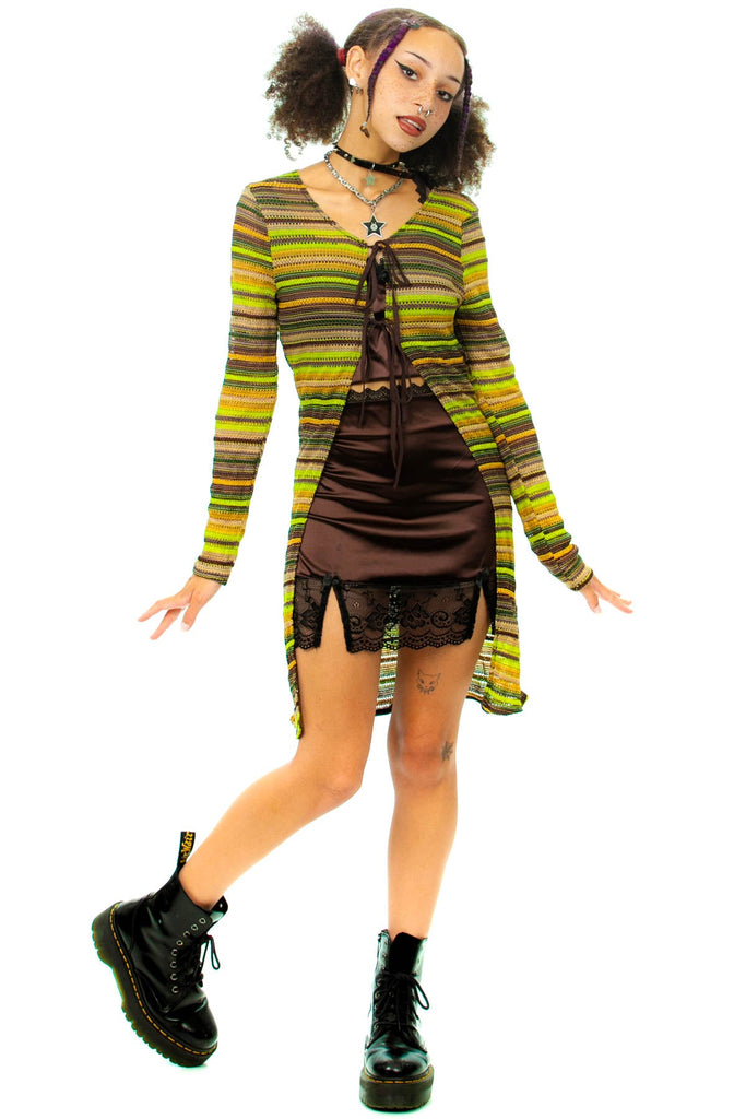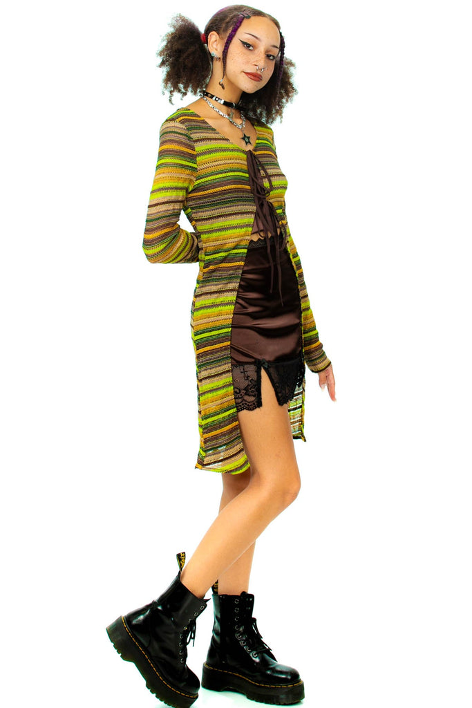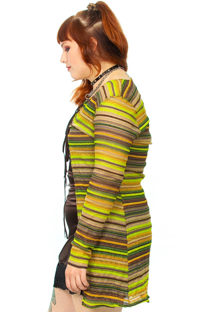 Green, brown and black striped mesh-look sheer midi cardigan with two tie closures at front!