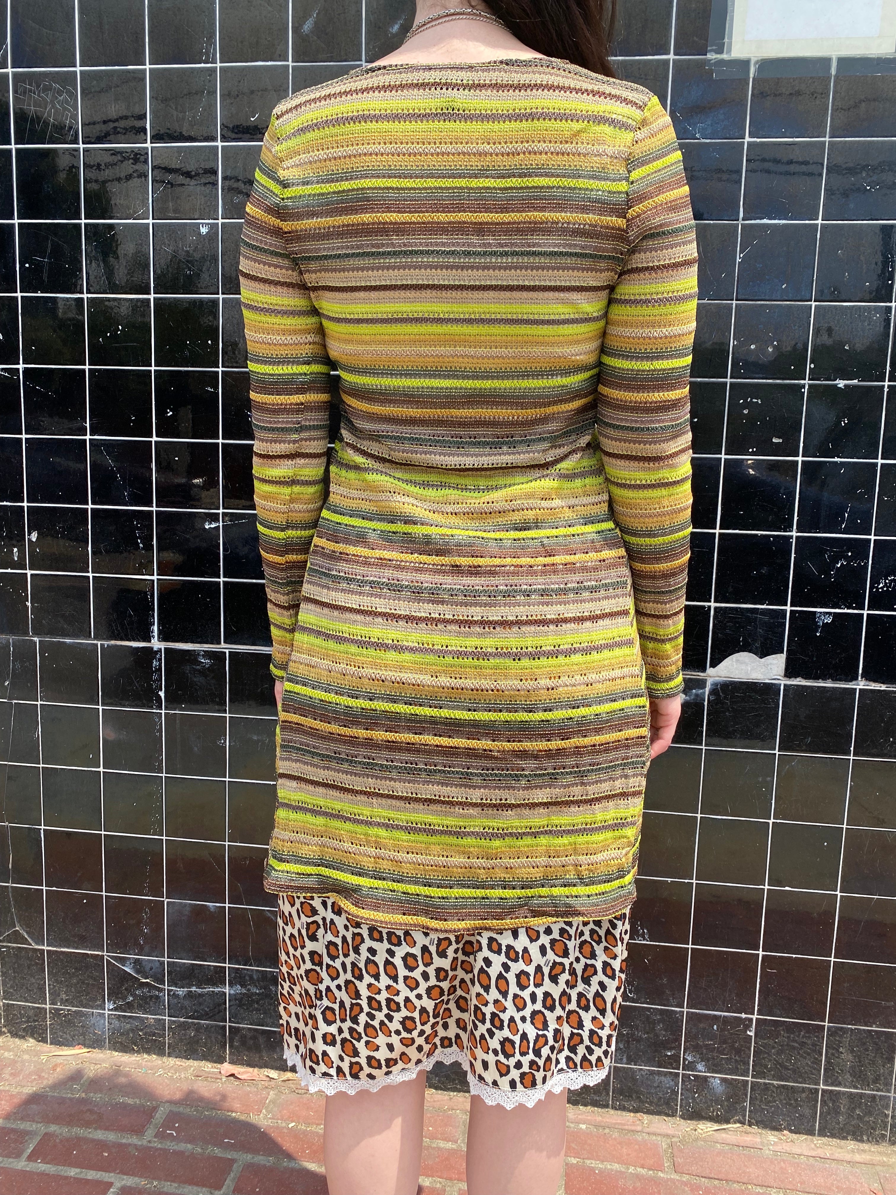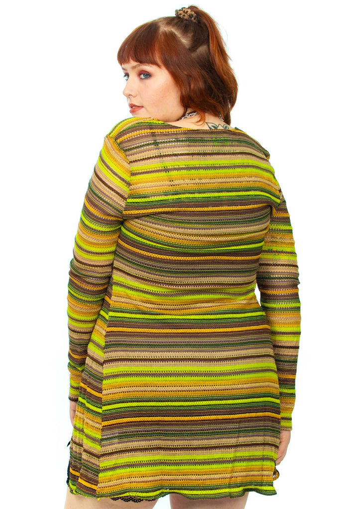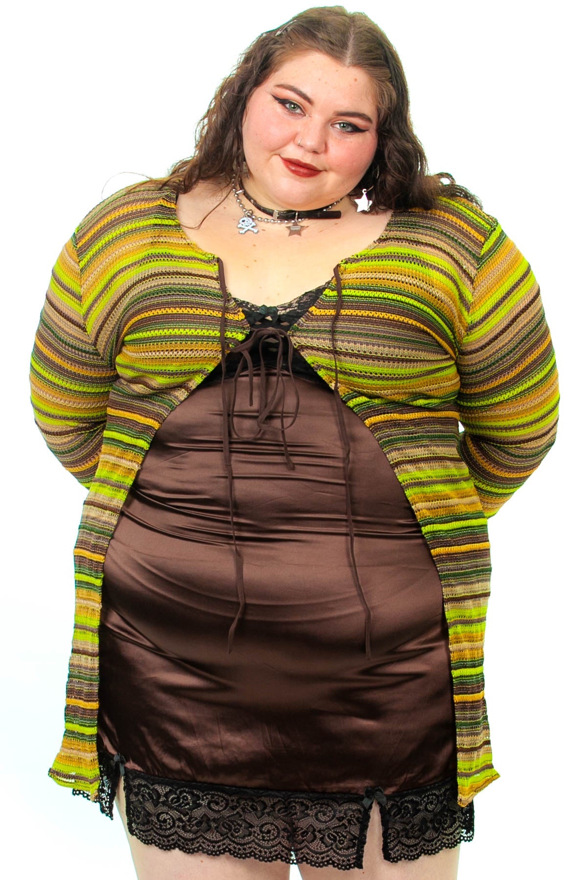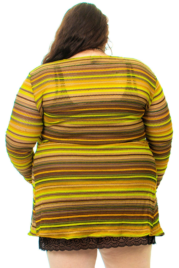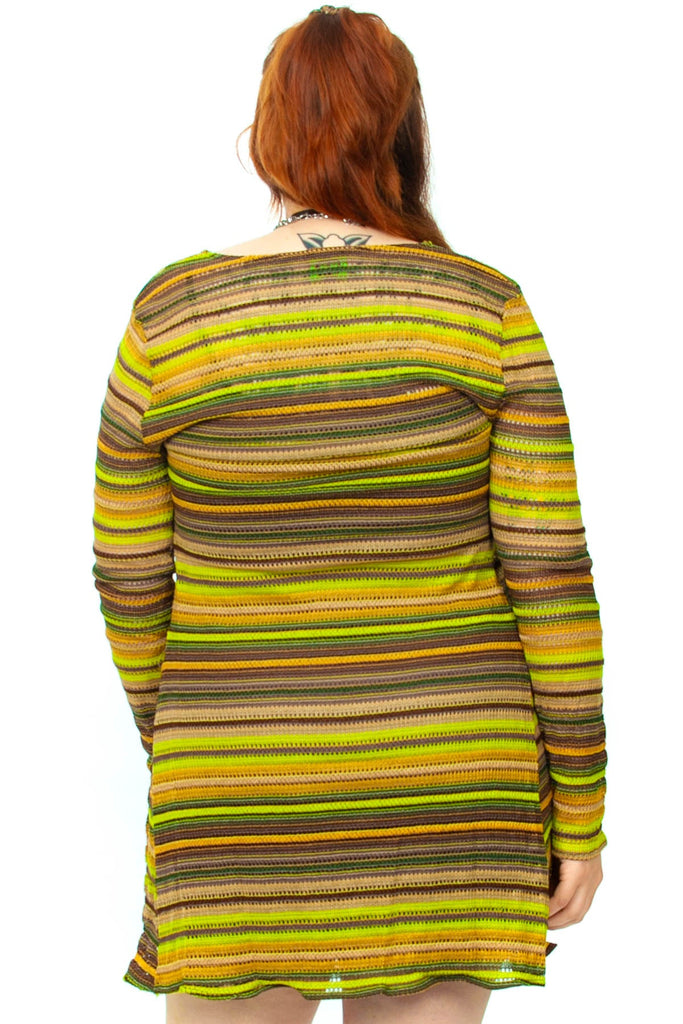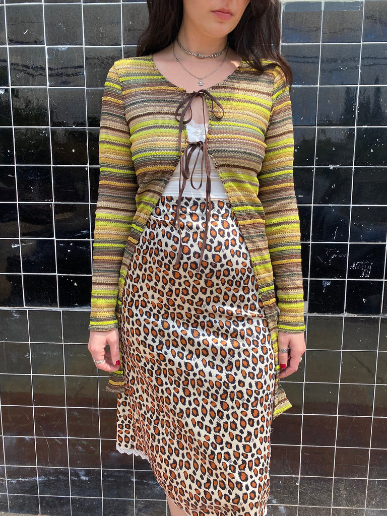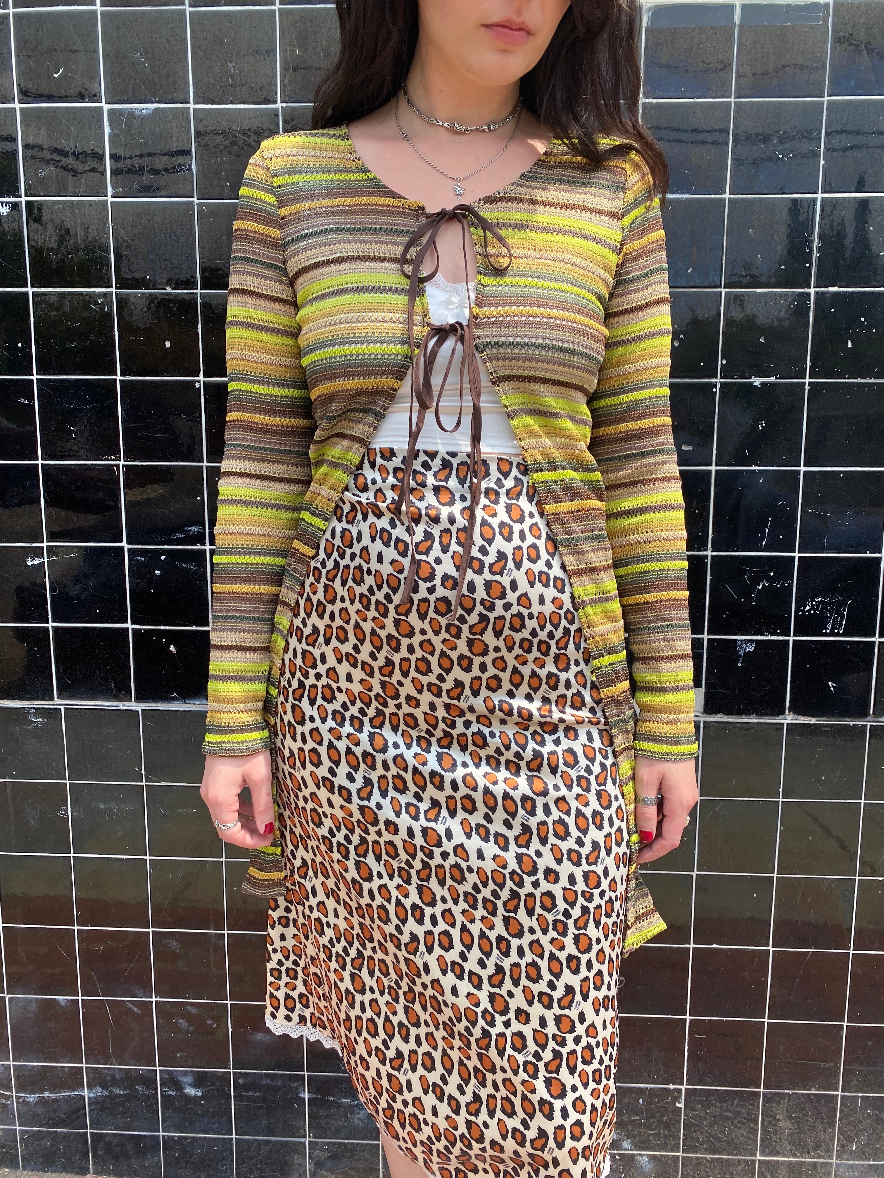 Green, brown and black striped mesh-look sheer midi cardigan with two tie closures at front!