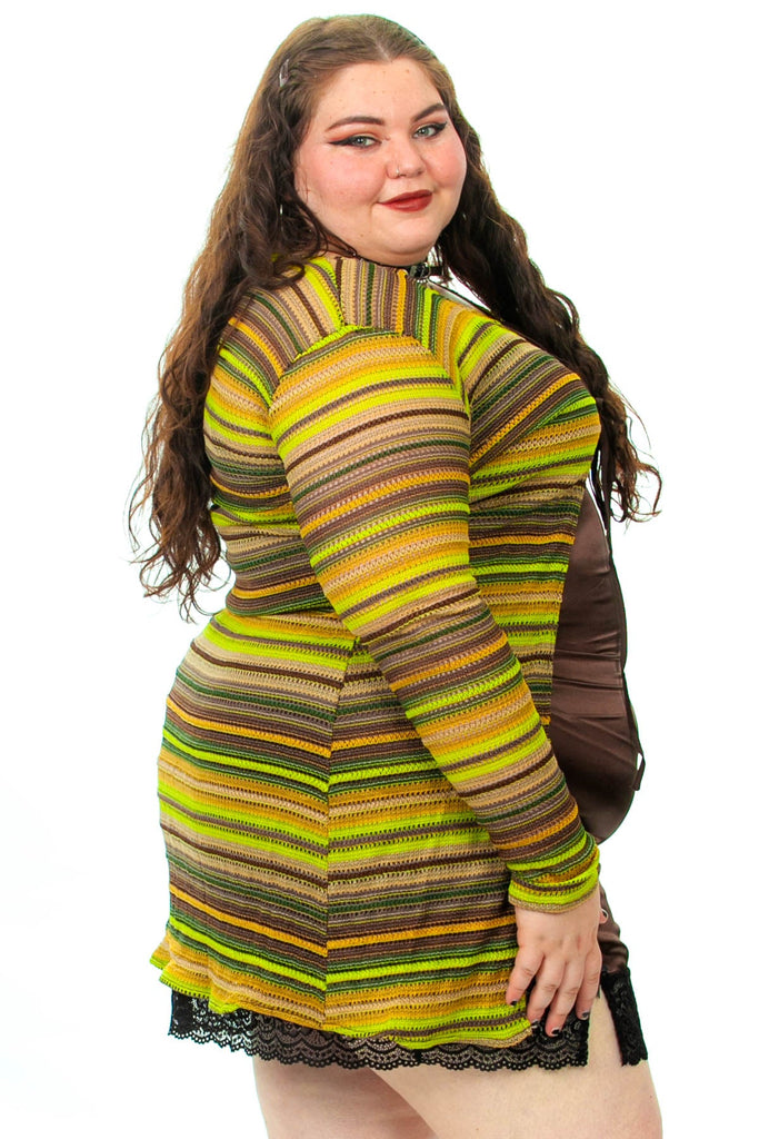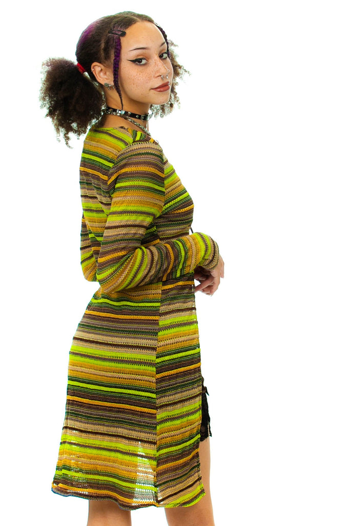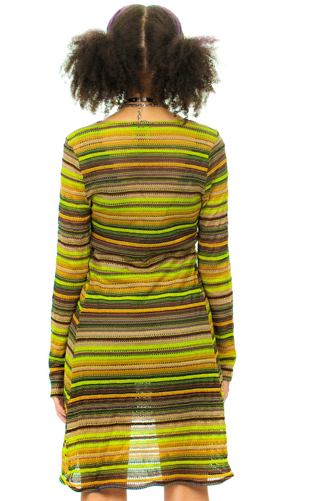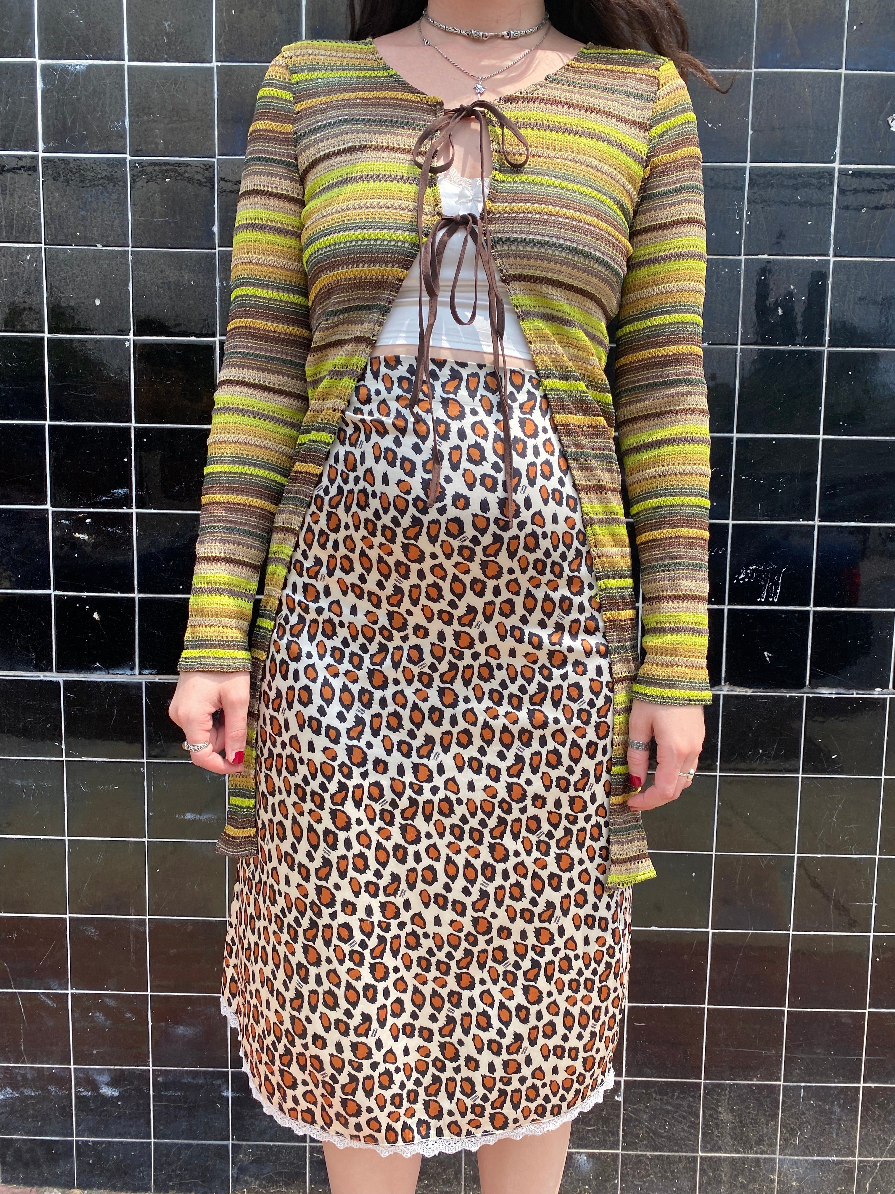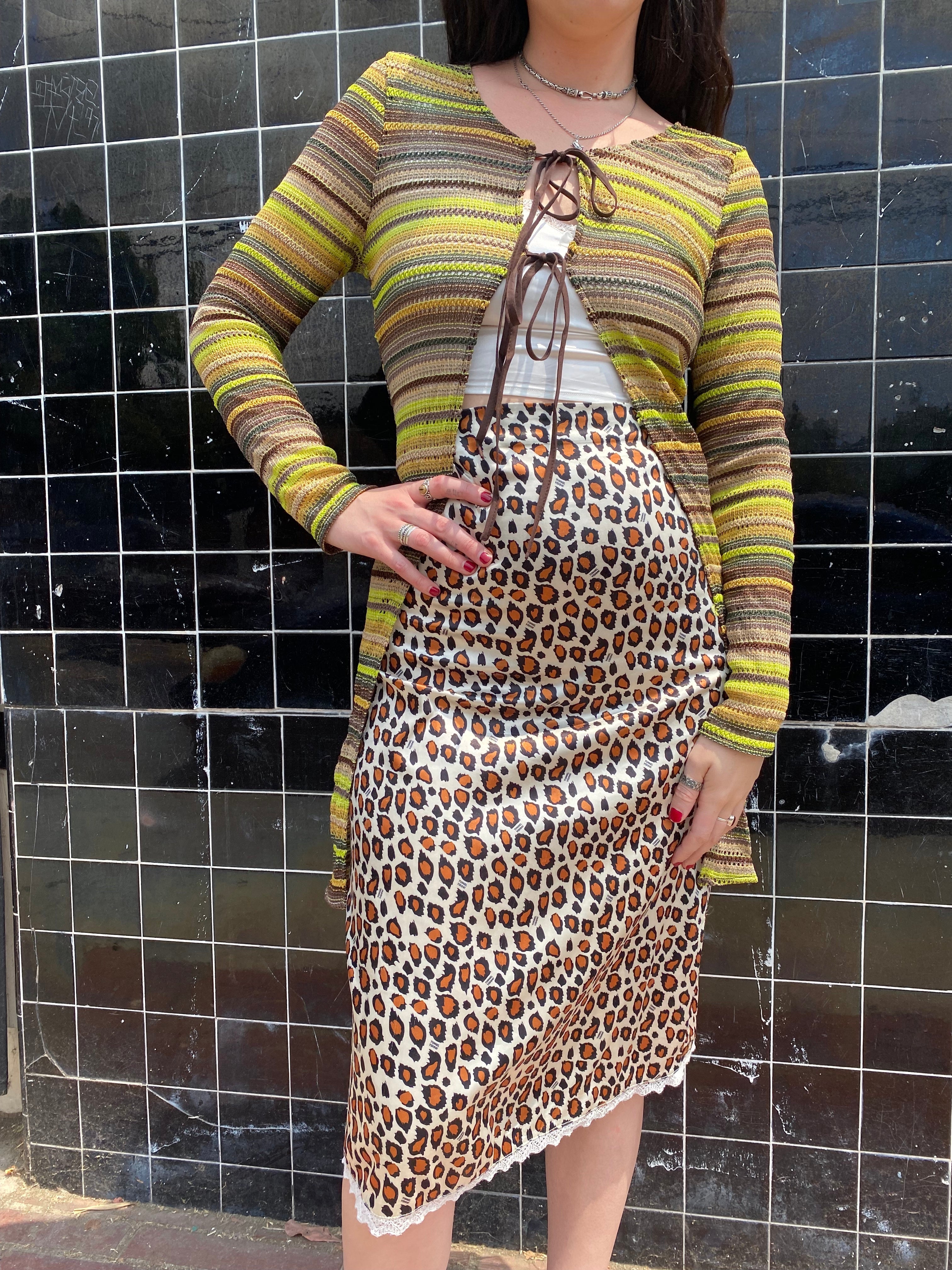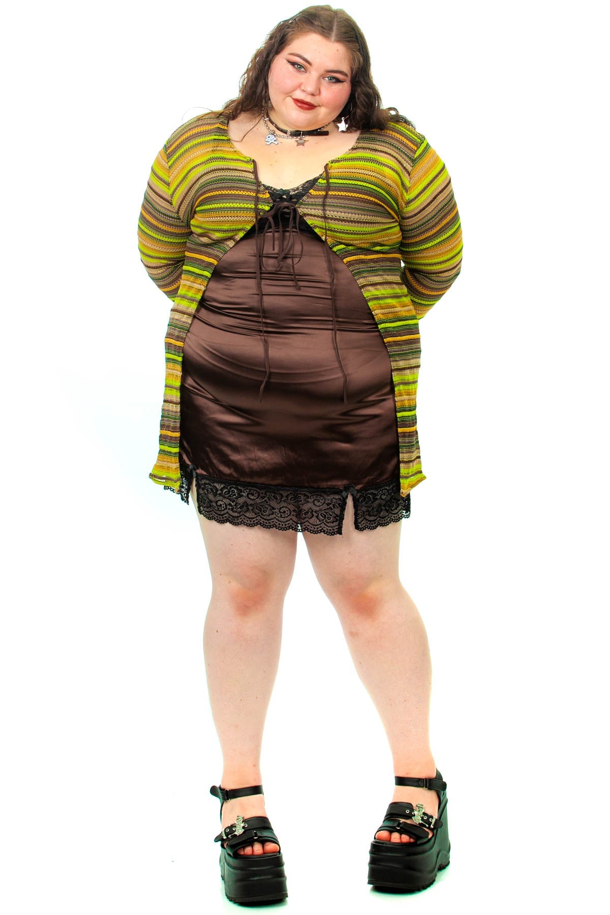 Green, brown and black striped mesh-look sheer midi cardigan with two tie closures at front!