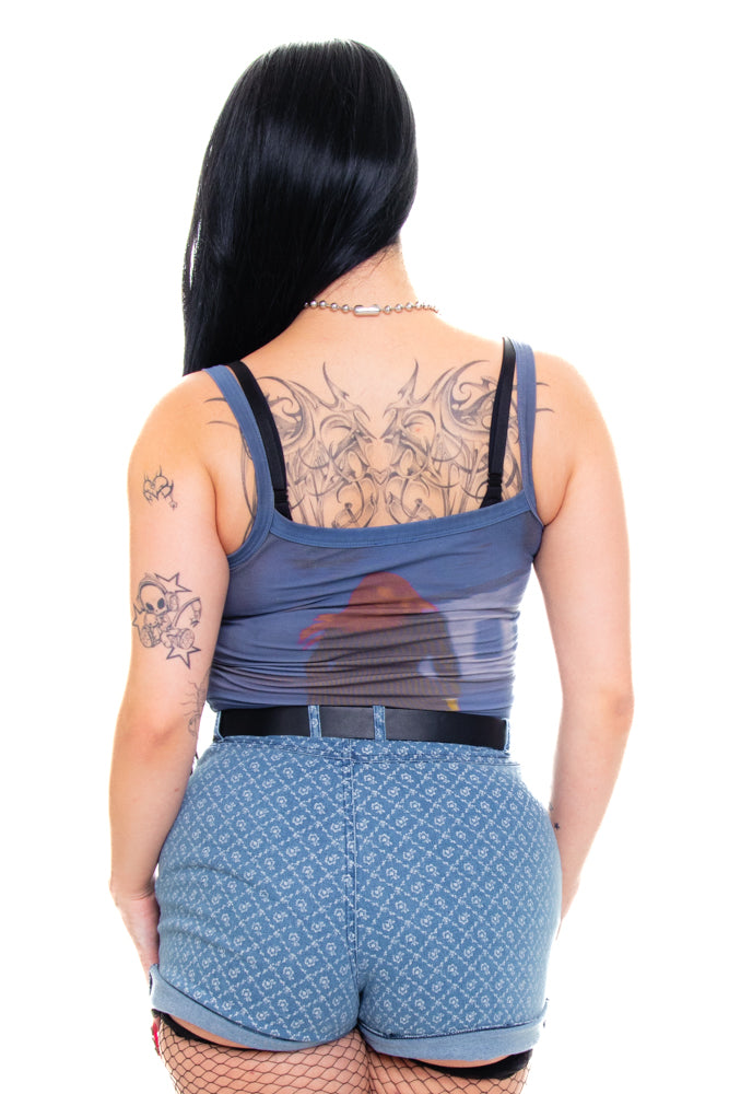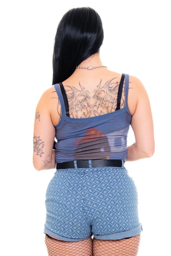 Light wash denim shorts with white floral print allover, two front pockets and zip and button closure!