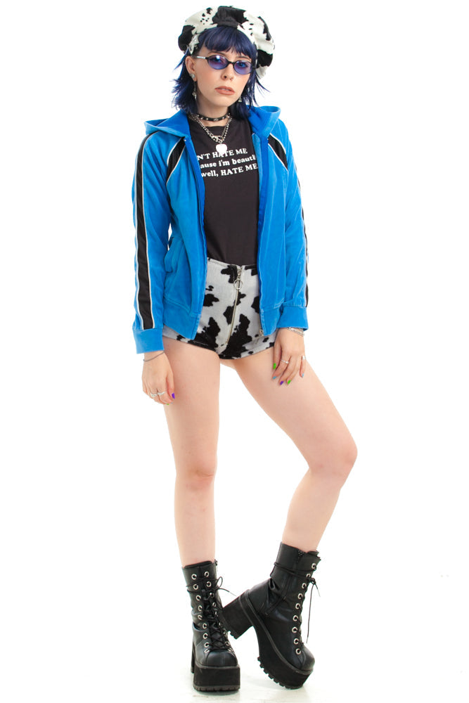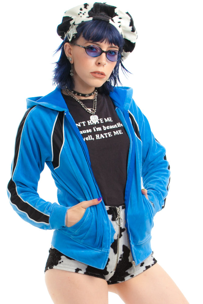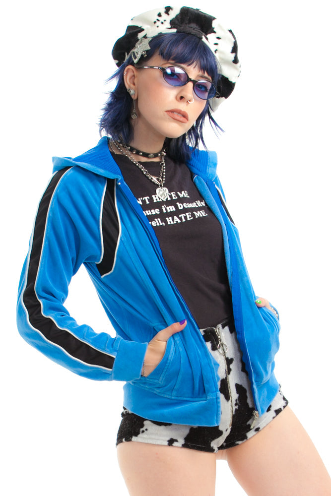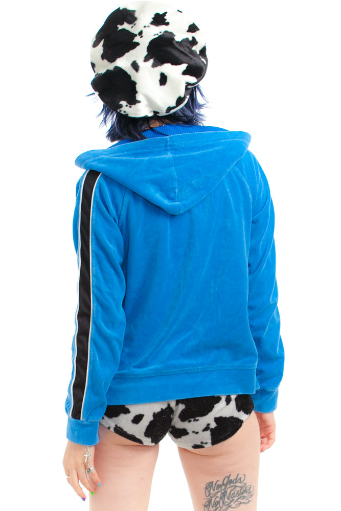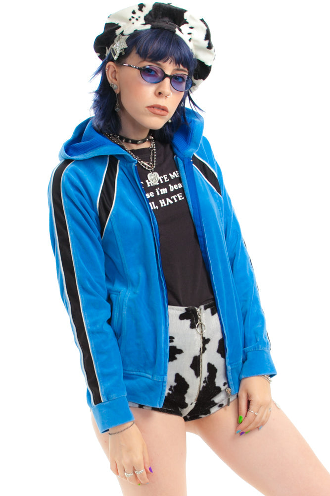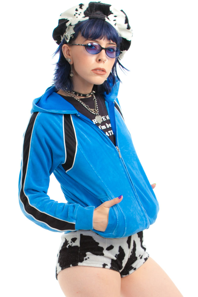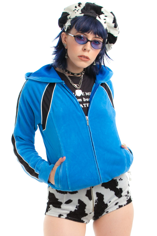 Blue velour hoodie with athletic mesh and raglan piping and contrast inset!