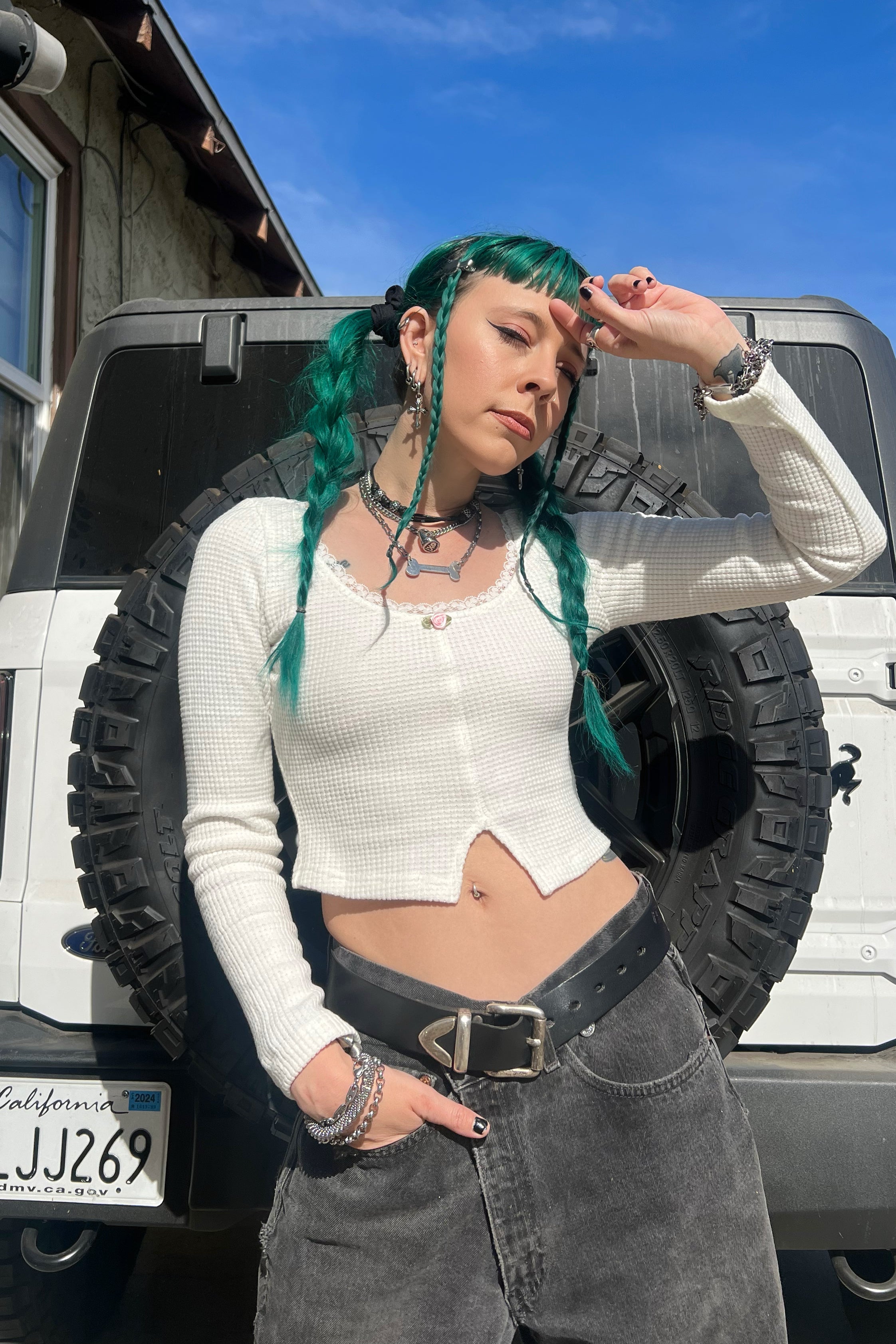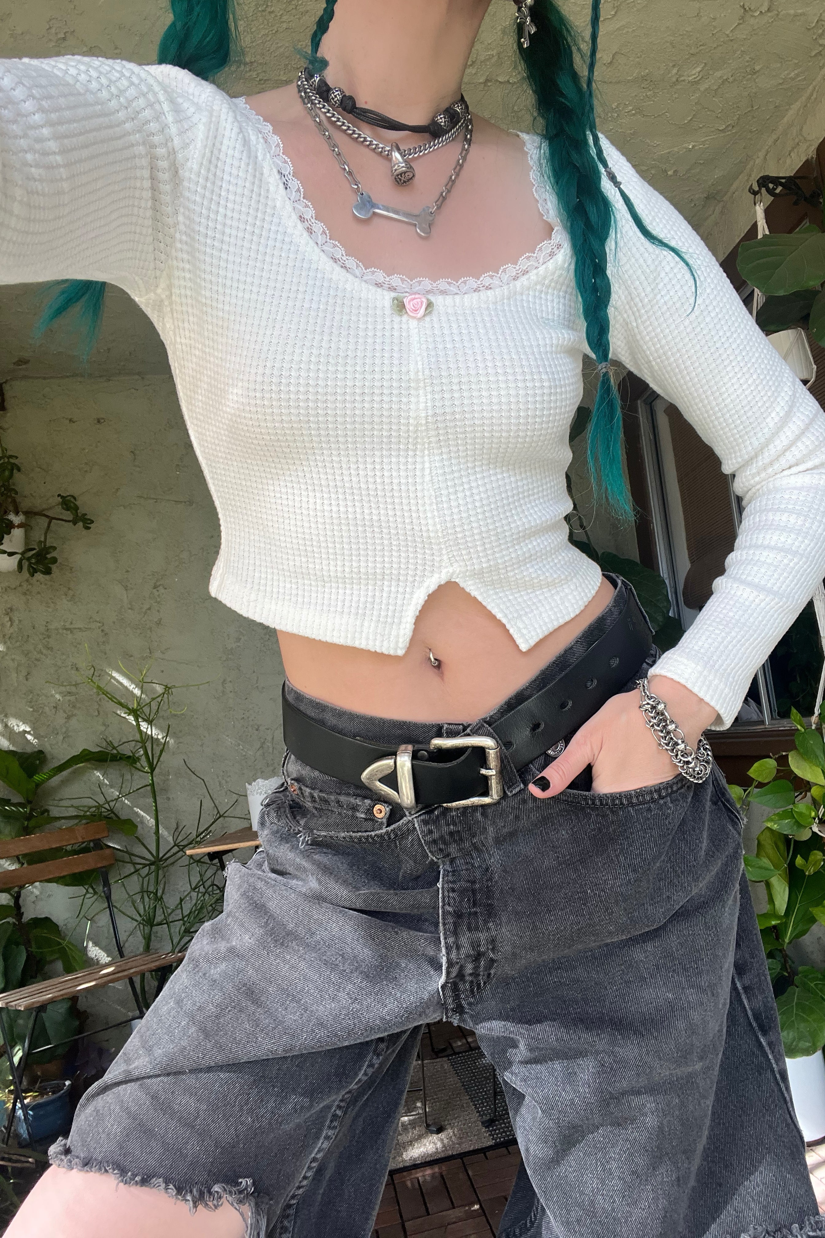 Waffle-knit thermal shirt with lace trim at neckline, rosette accent, and notched hem!