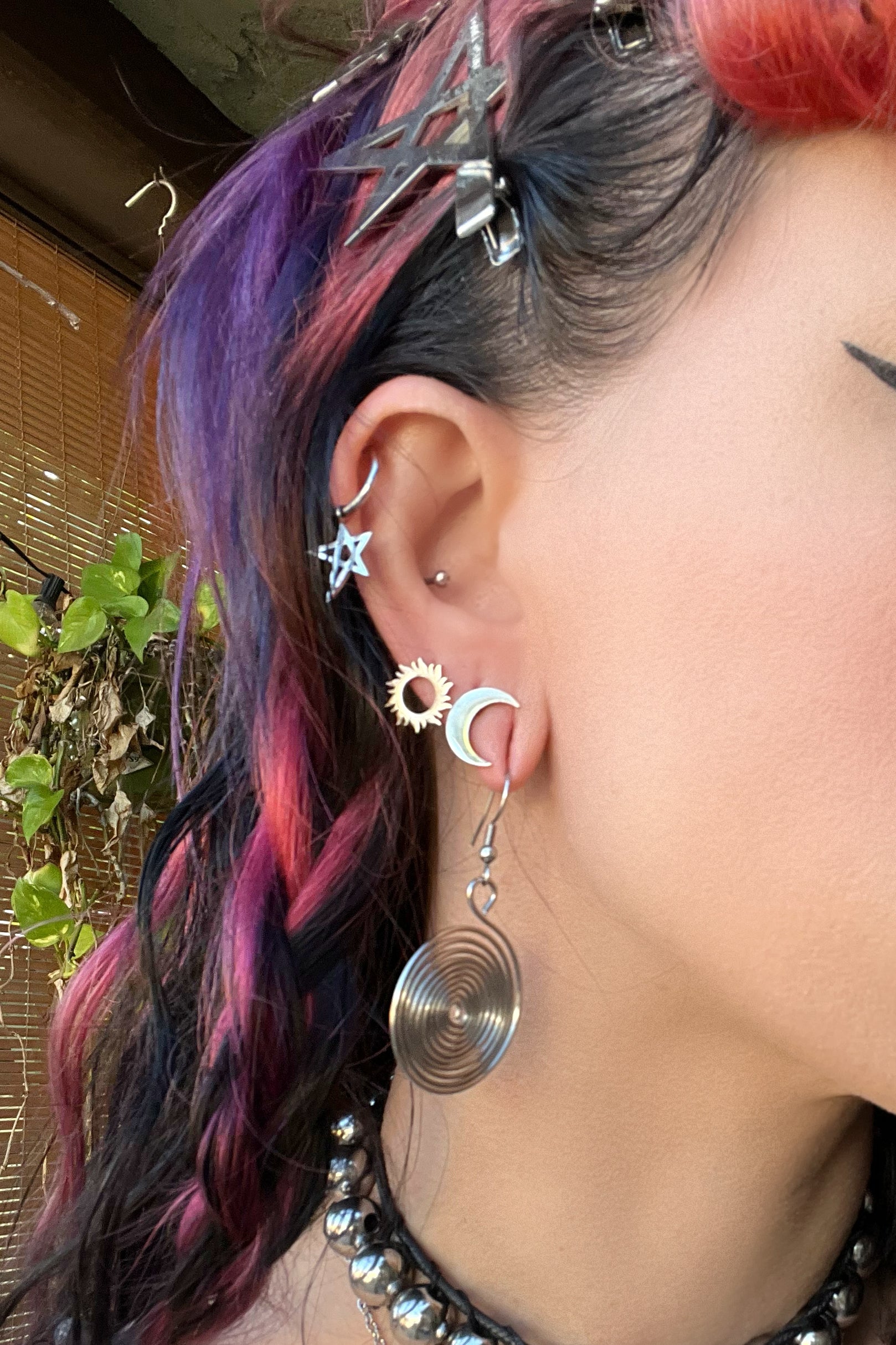 Set of 2 approximately 0.5" diameter earrings with black hole sun and crescent moon design on stud backing