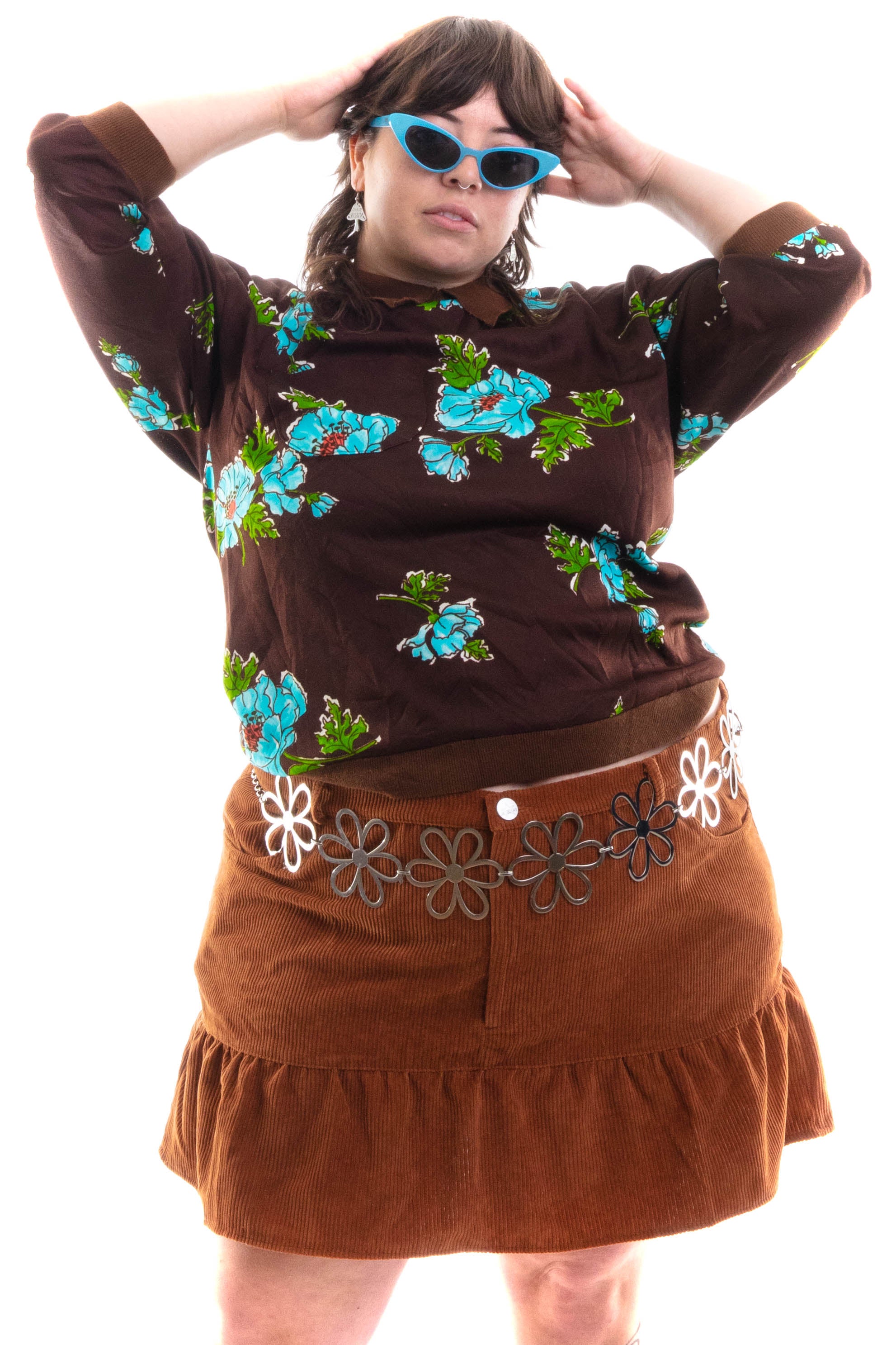 Vintage 70's Brown collar long-sleeve with cool blue floral all-over print with a front pocket!!