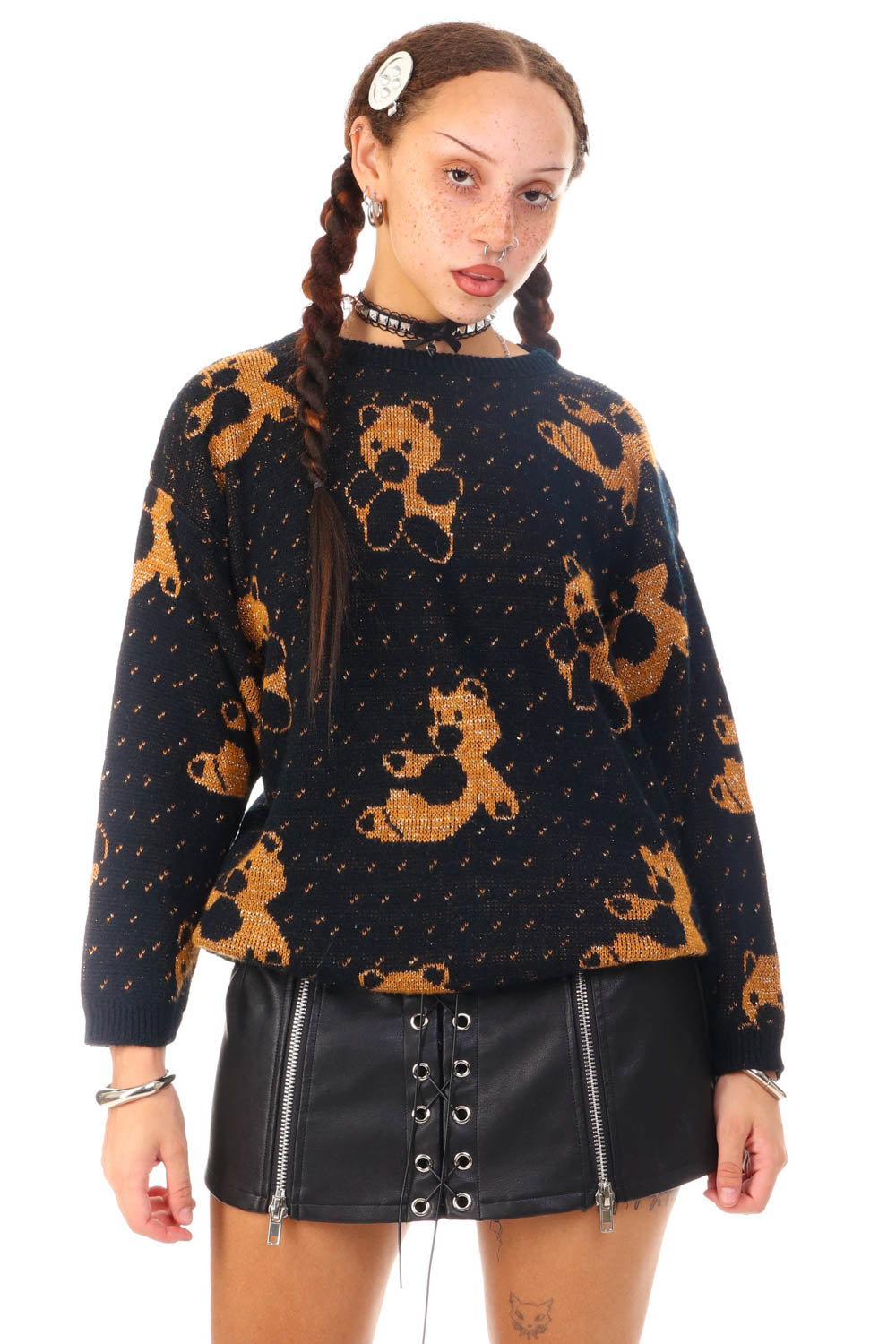 Love a good 80's graphic!! Super adorable black knit crewneck sweatshirt with cute worn look! Has front graphic of a sweet gold sparkly teddy bears!