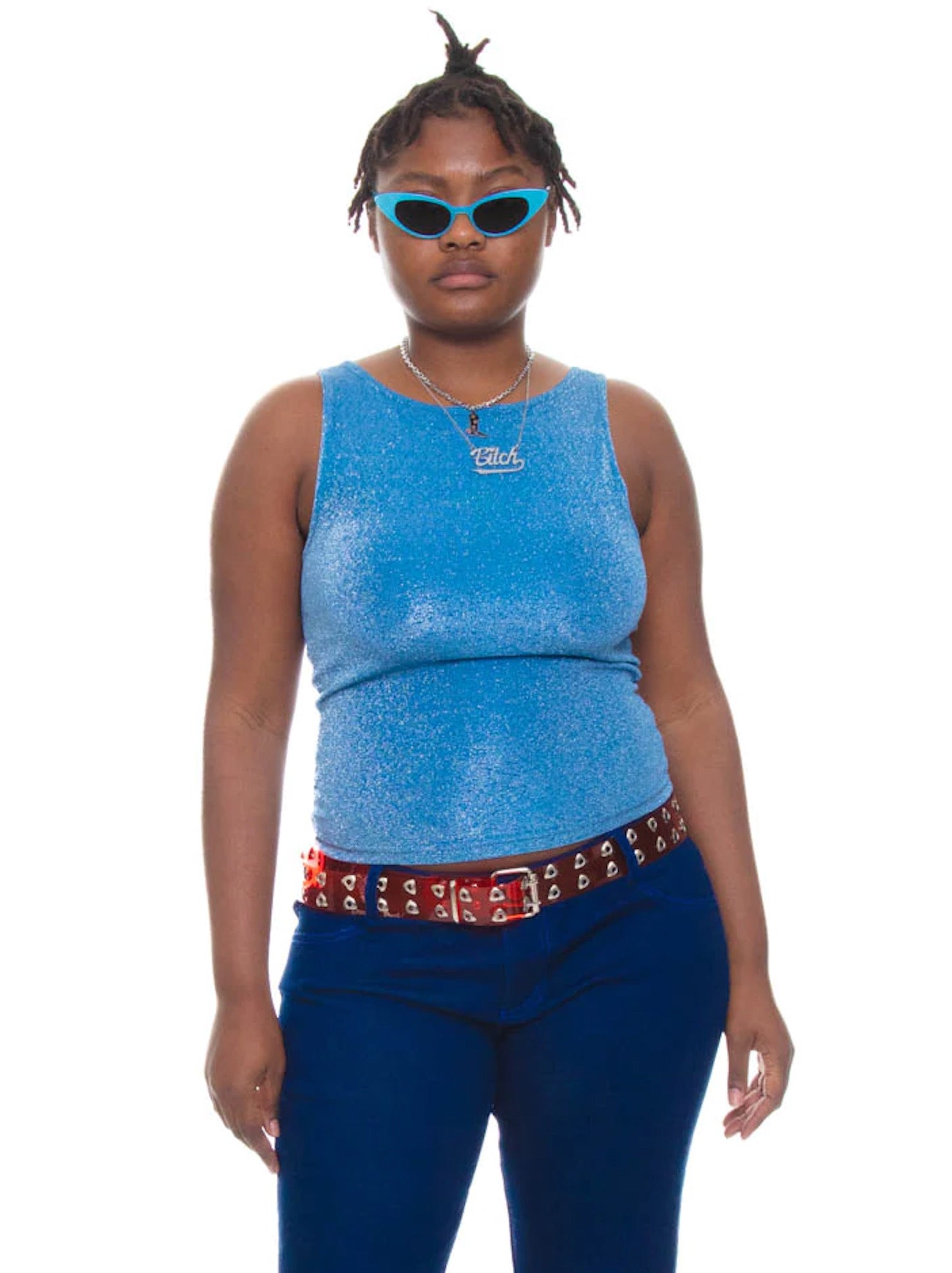 Super cute vintage 90's blue glittery tank top with cute straps across the back!!