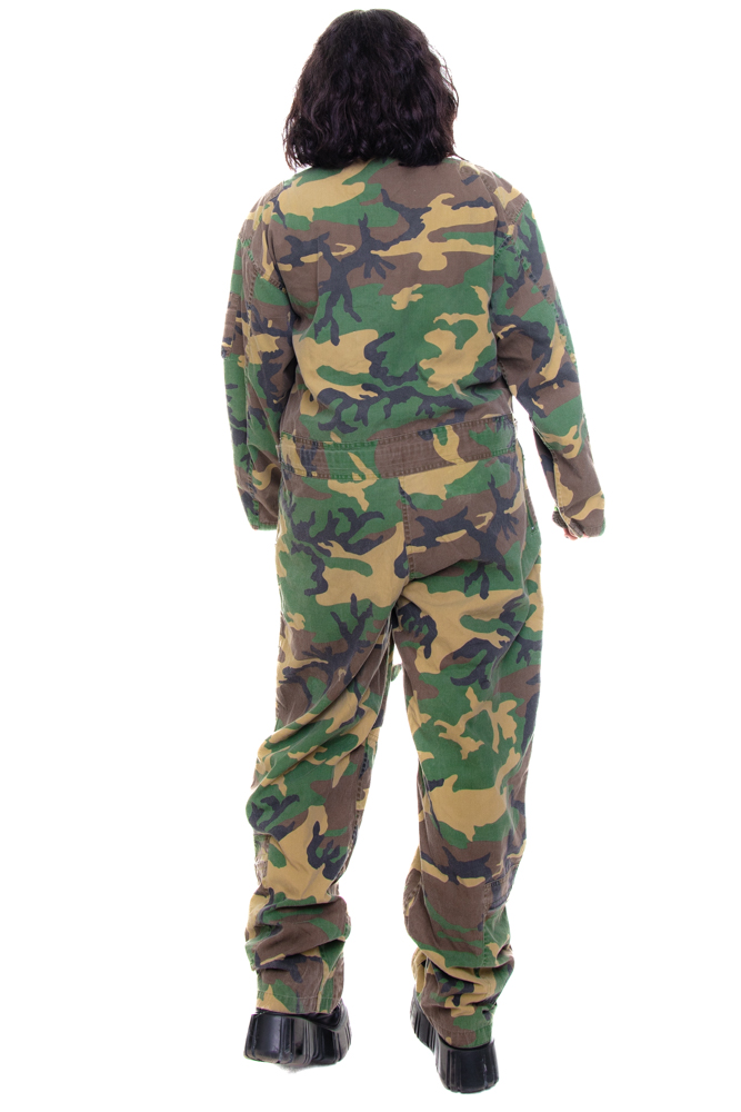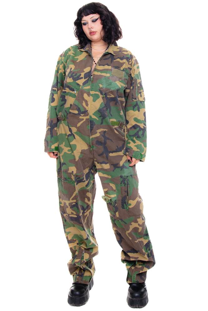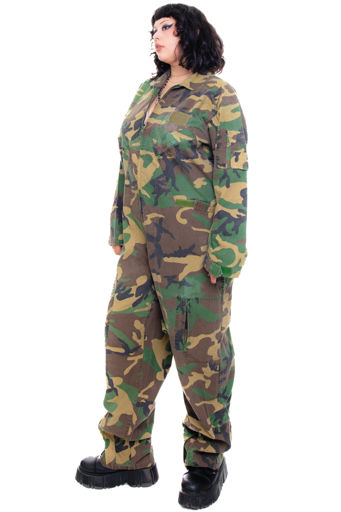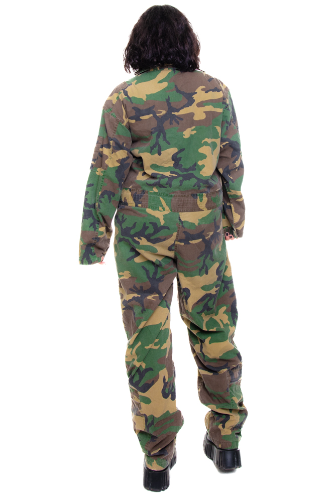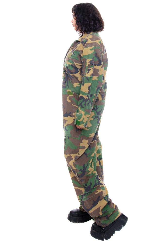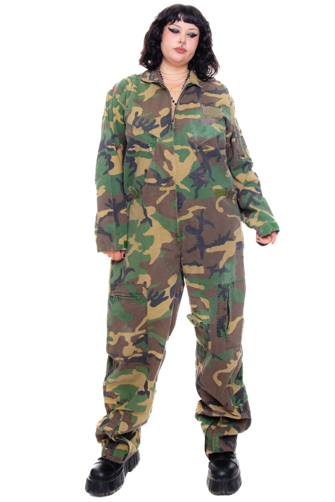 Canvas one-piece coveralls in camouflage with zipper closure at front!