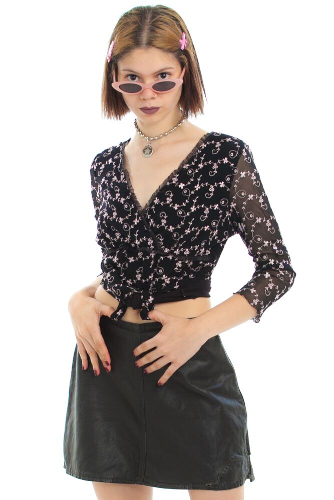 Black long-sleeved top with sheer sleeves. Pink embroidered flowers all over!