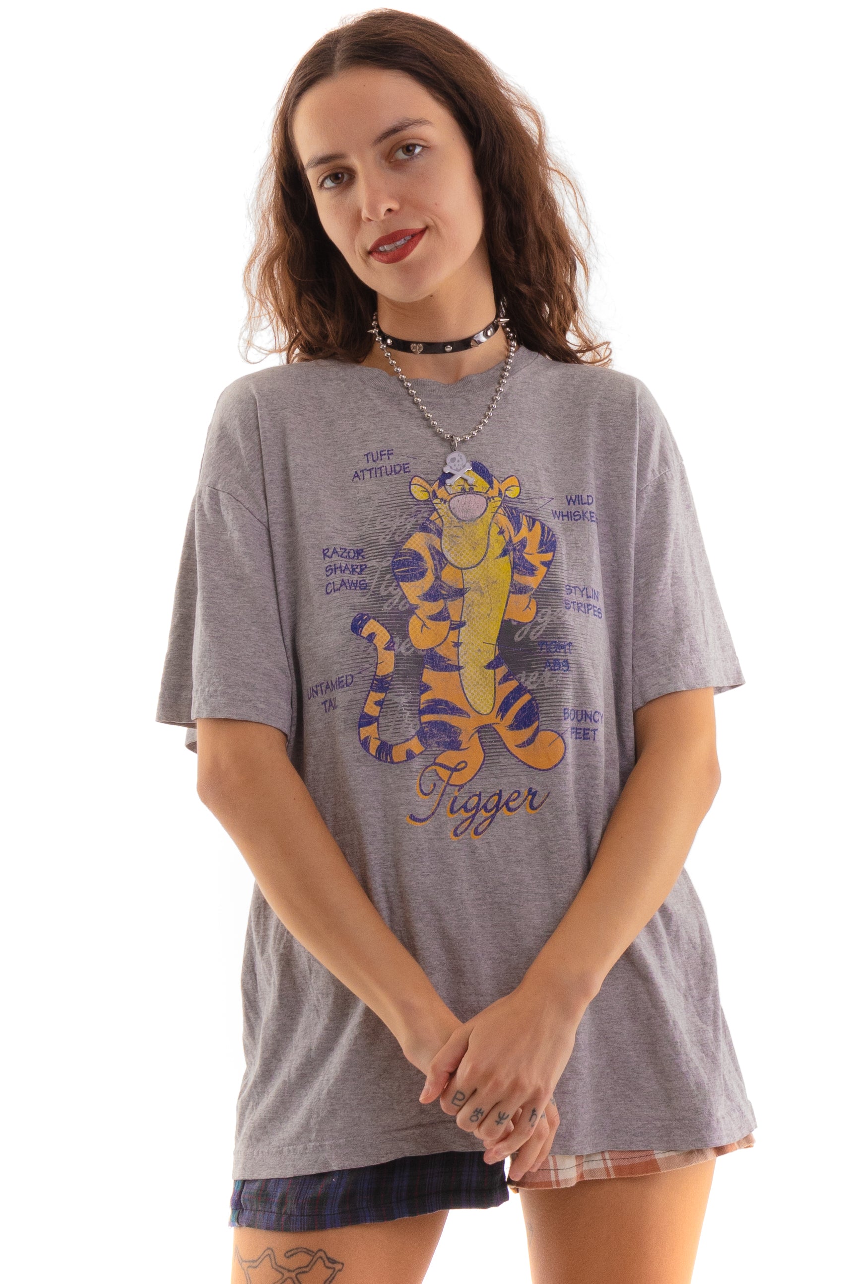 Fun 90's Winnie the Pooh's Tigger super soft t-shirt in heather grey, cute oversized fit with faded glitter graphic on the front with Tigger with text describing him! " Tuff Attitude" "Wild Whiskers" "Stylin' Stripes" " Tight Abs" " Bouncy Feet" "Untaimed Tail" "Razor Sharp Claws" " Tuff Attitude"