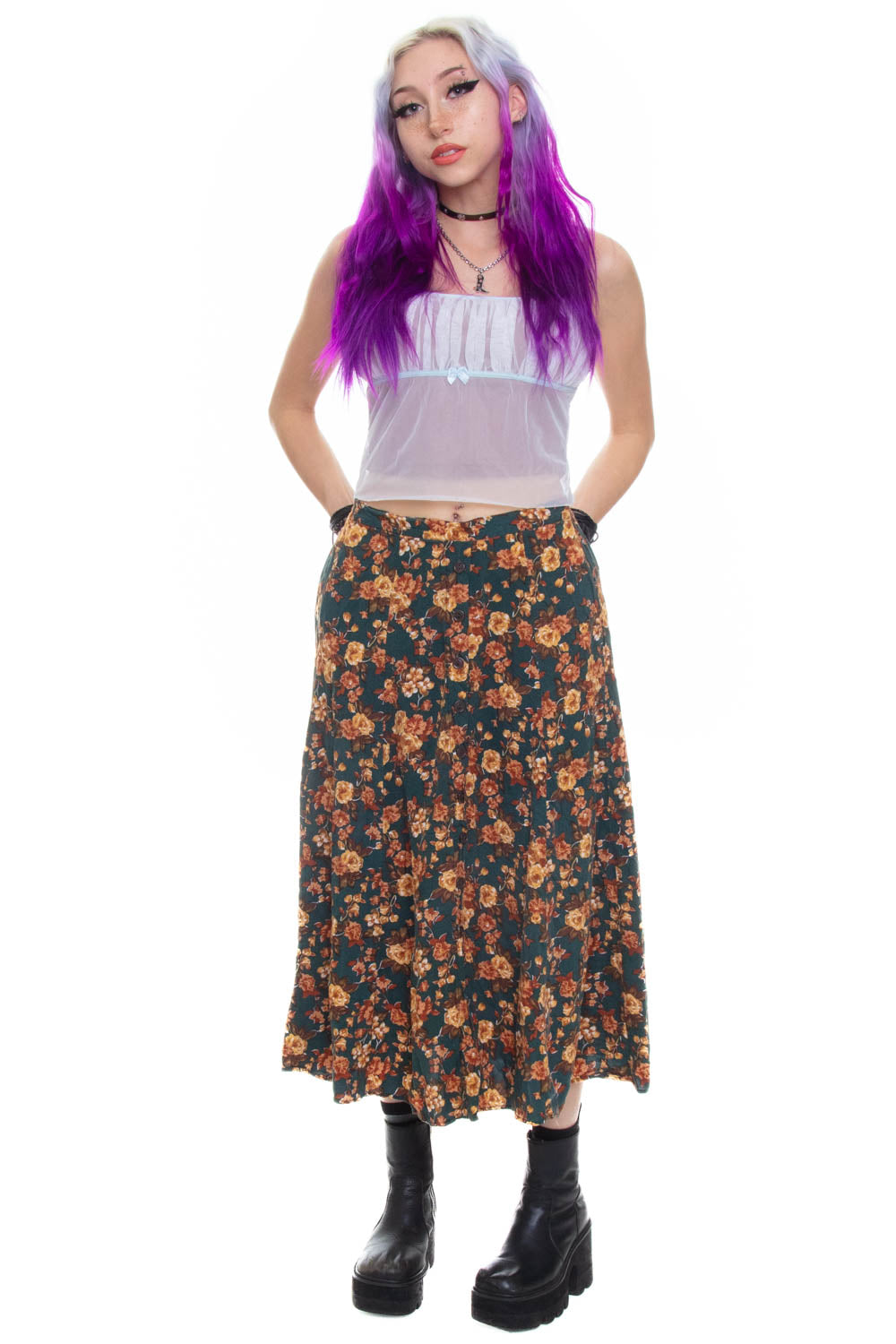 Beautiful vintage 90's maxi skirt in dark green skirt with brown roses printed all over! Has elasticated section of waistband at back with cute buttons all the way up the front! Perfect mall wear !