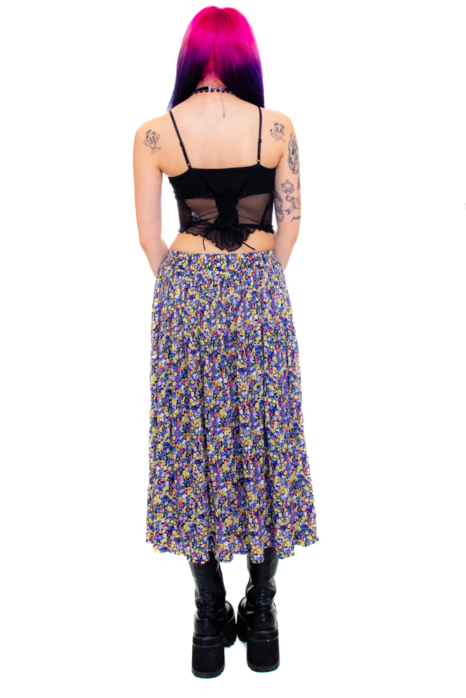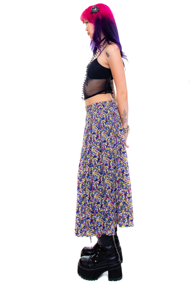 Vintage maxi skirt with black backing and allover floral print! Drawcord at waist.