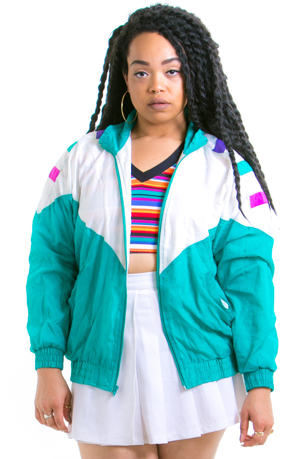 White, teal, and purple windbreaker! Fully lined, super soft, zip up front, pockets at front as well.