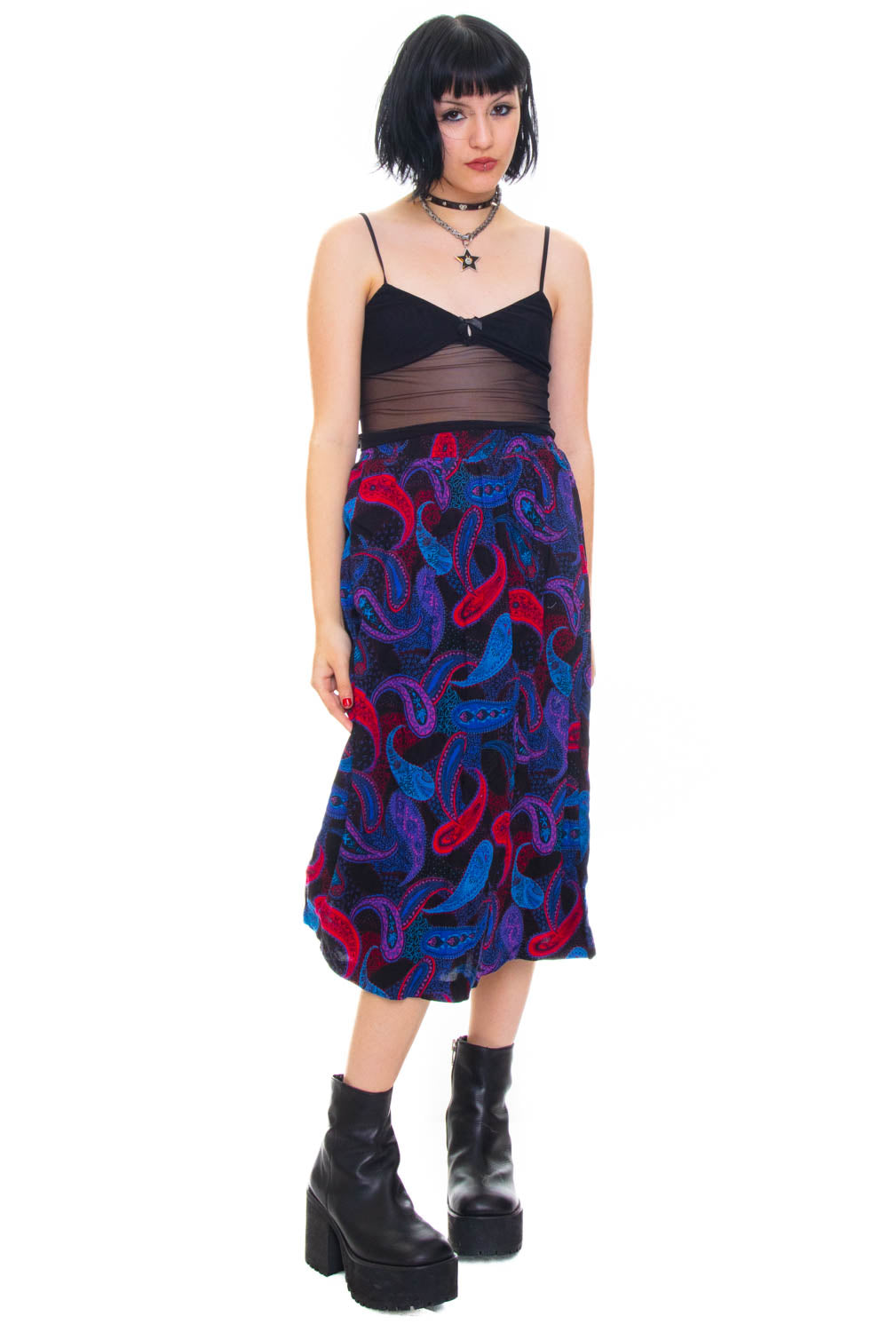 Vintage 90's classic floral/paisley all over print skirt with really comfortable elasticated waist band ! Black base with neon pink, purple, red and blue!
