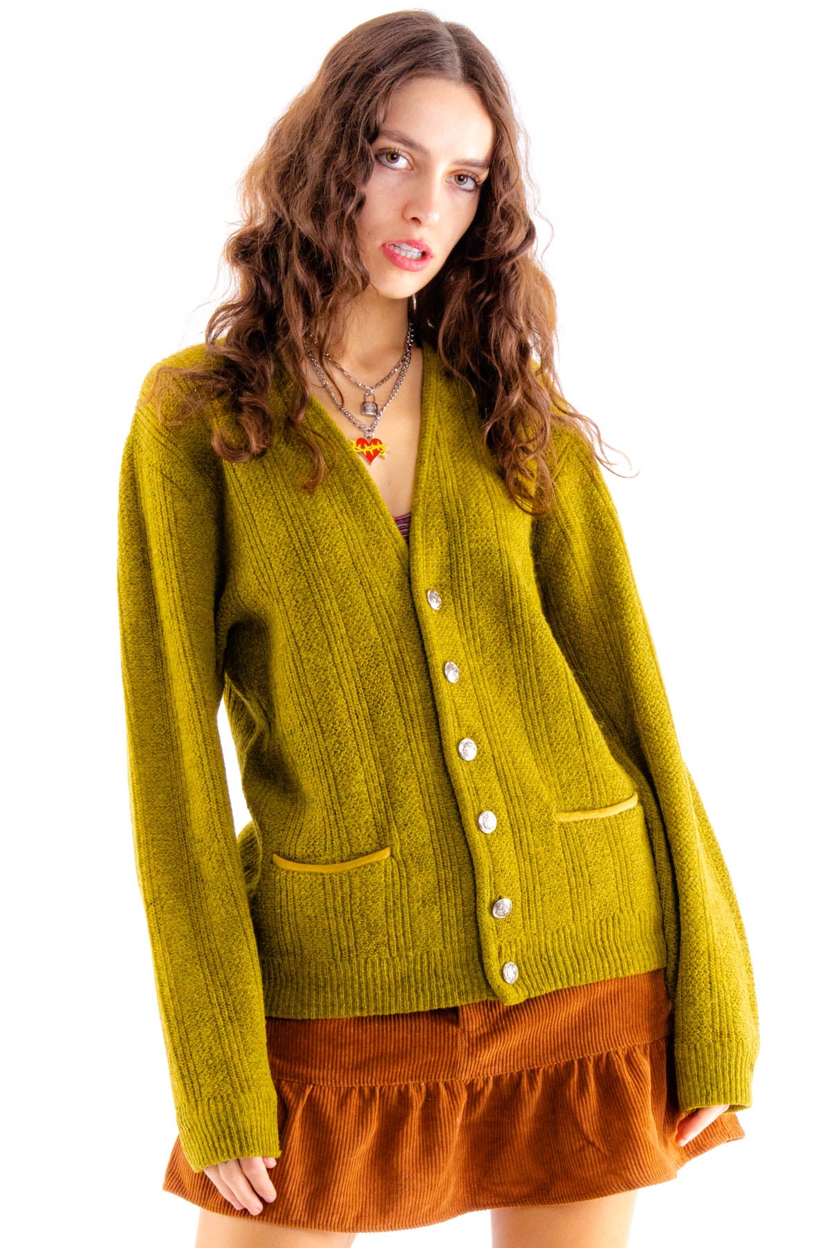 Gorgeous olive green knit cardigan with a v neck and front silver button closure! Pockets have a nice green suede detail!!