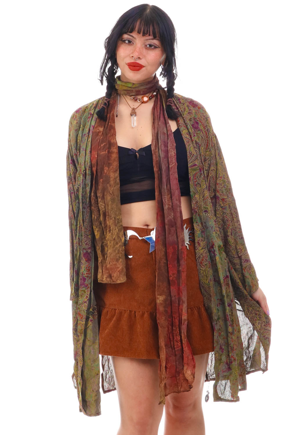 Vintage 90's shirt jacket with all over gem toned paisley print !!! Very lightweight and comfortable!! With tie dye attached long sheer tie with glitter !!