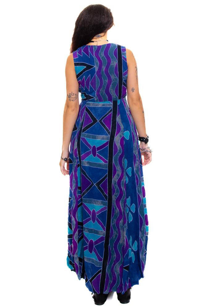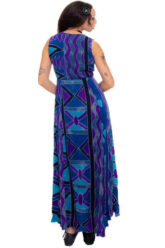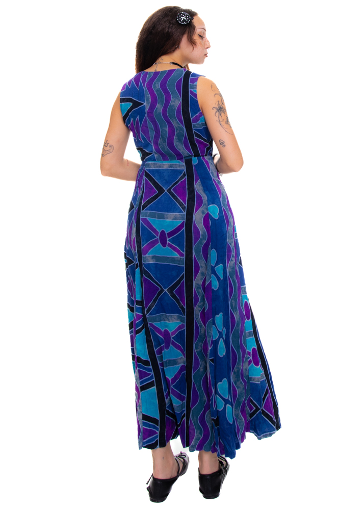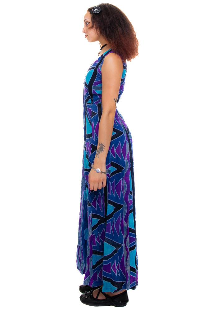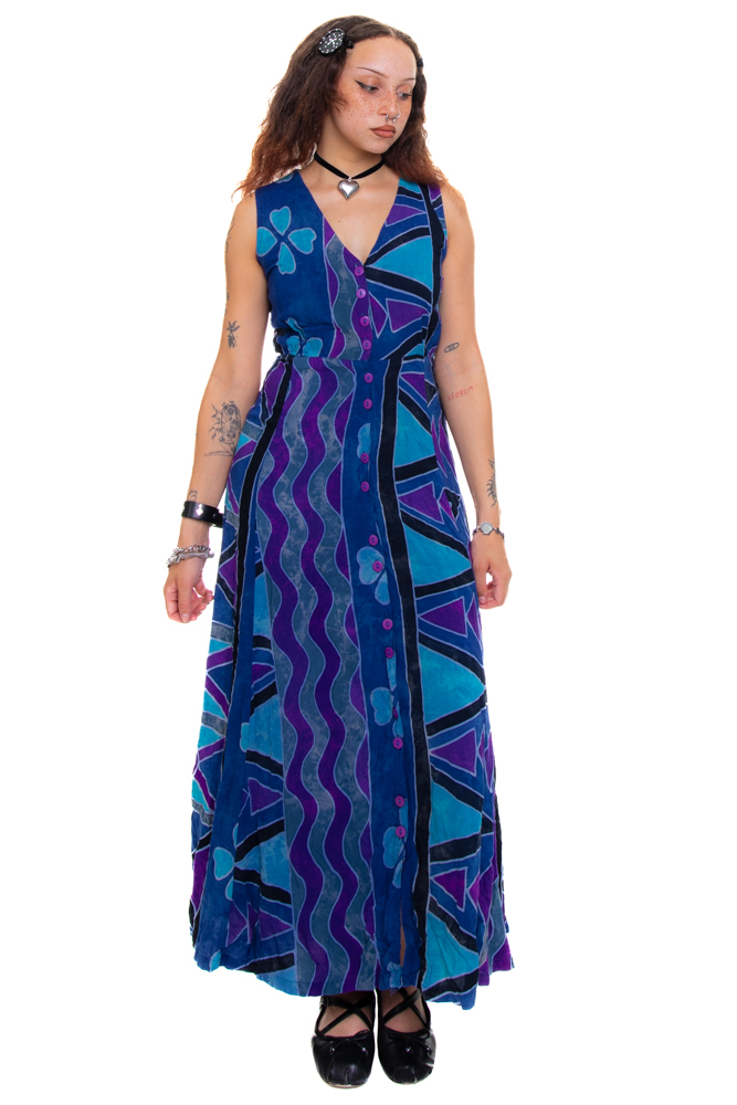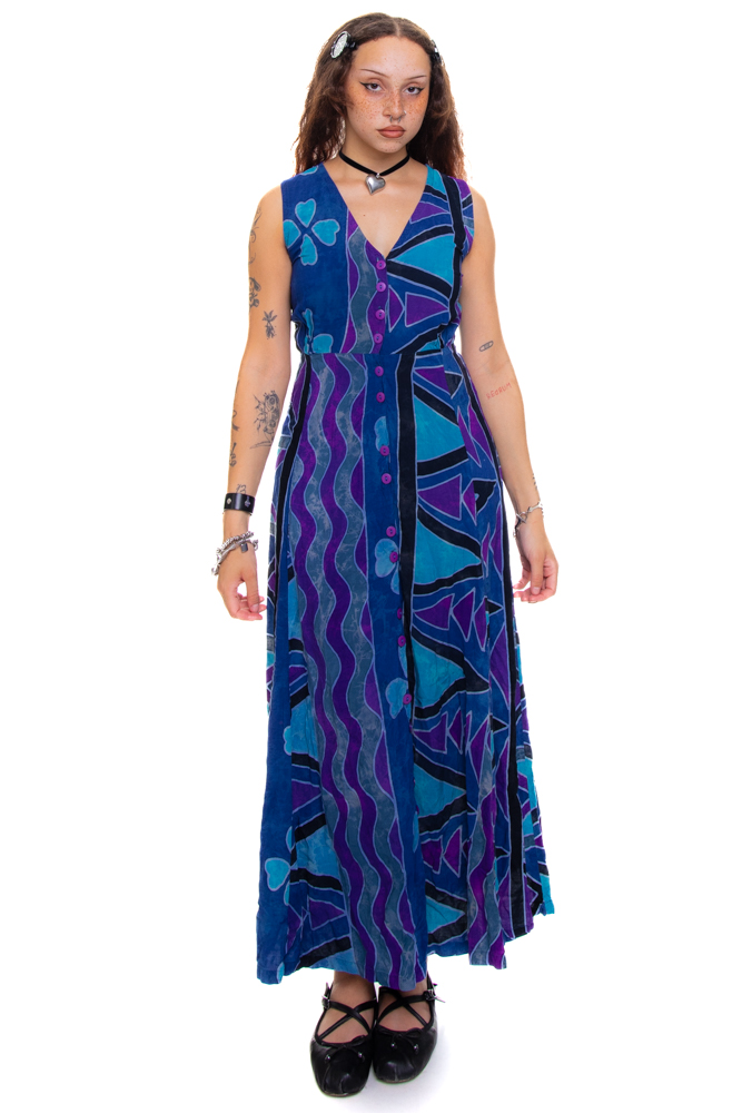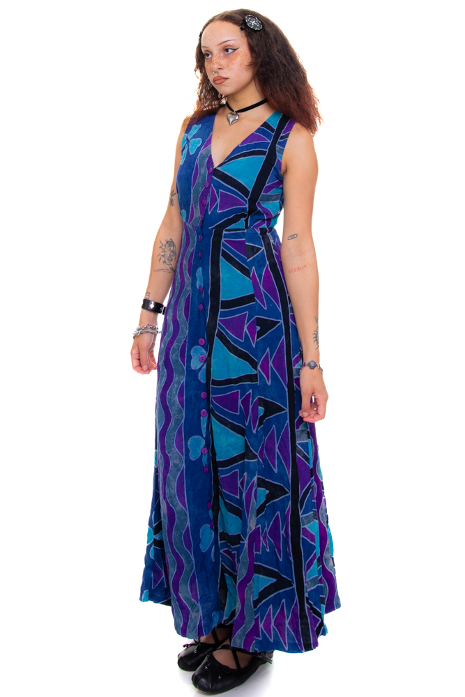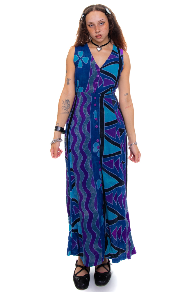 Woven maxi dress with button closure at front and allover jewel-toned print! Shirred bust.