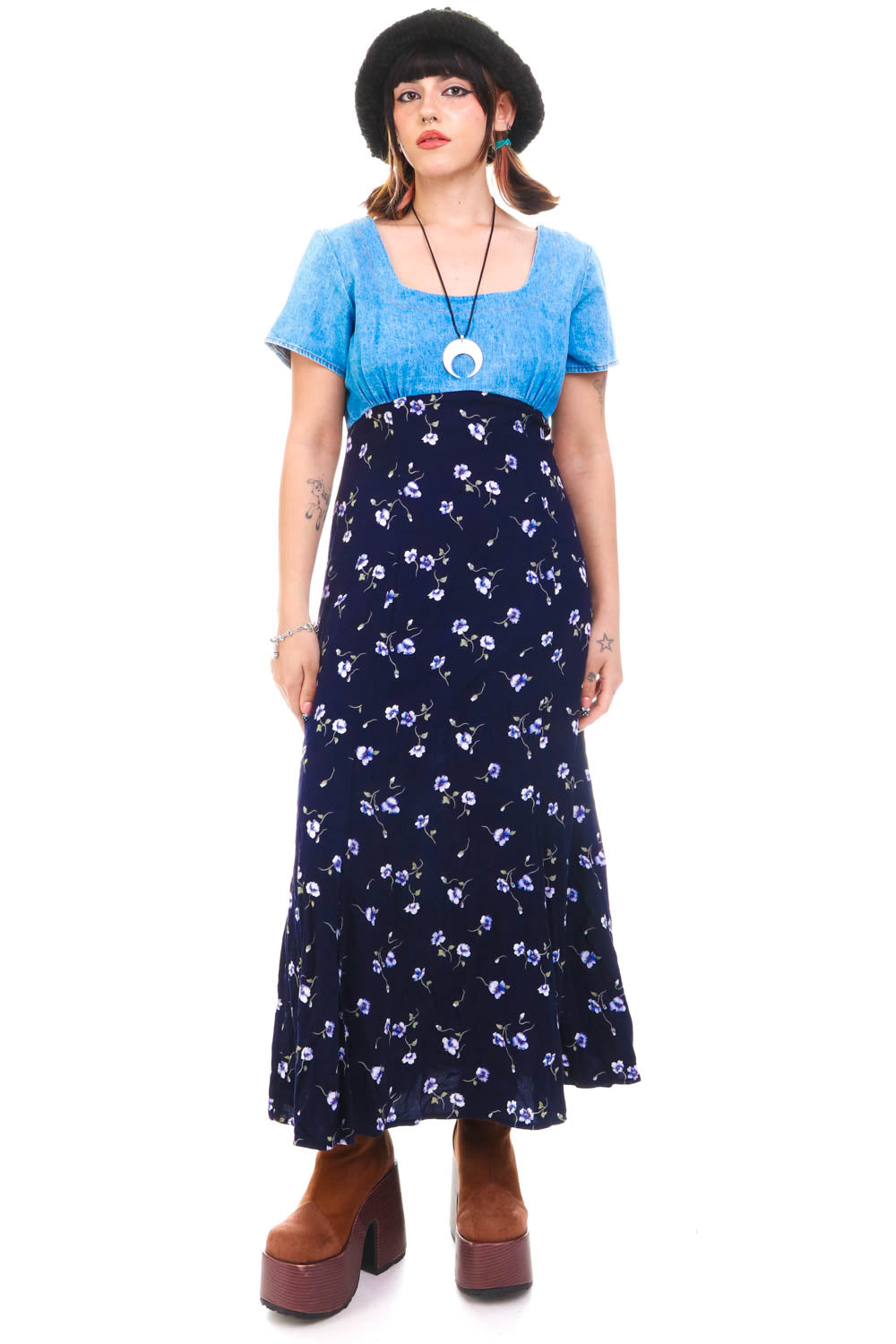 Vintage 90's Romantic Denim Floral Maxi Dress