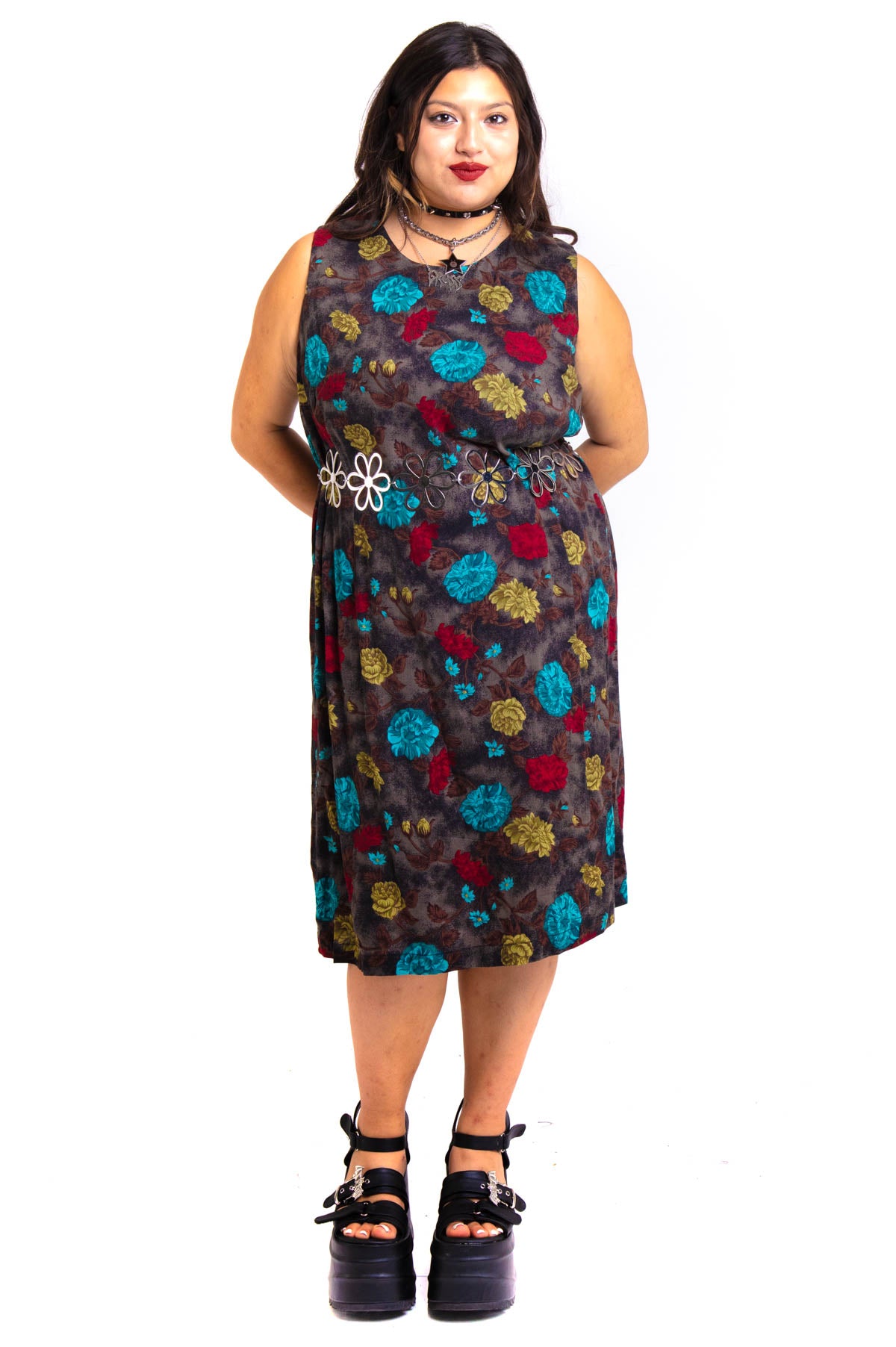 Super cute vintage 90's shift tank dress, grey and black asphalt body with blue and red flowers ! Zip back closure!