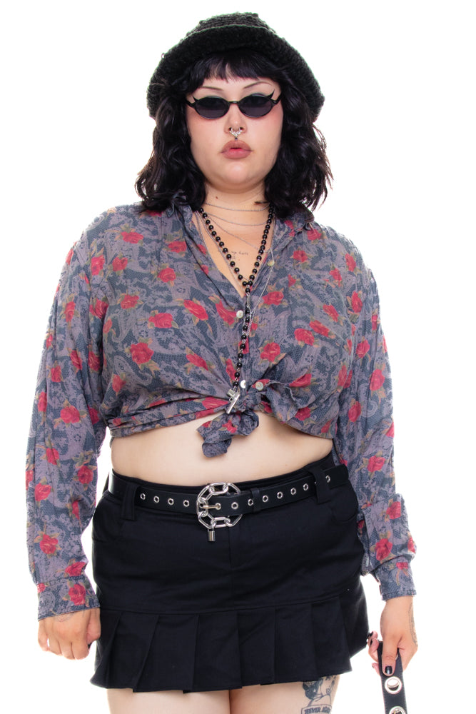 Silk blue-grey shirt with allover lace and rose print! Button closure at front.