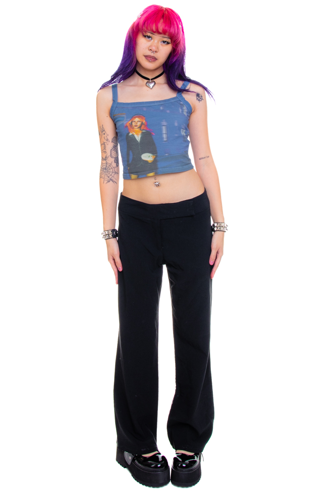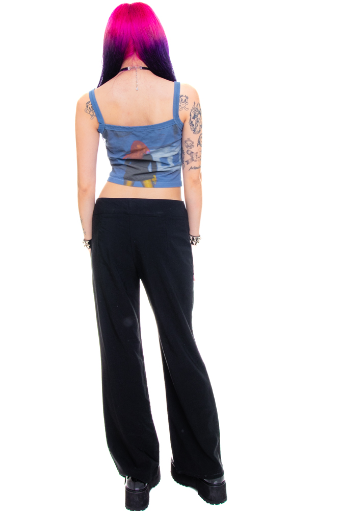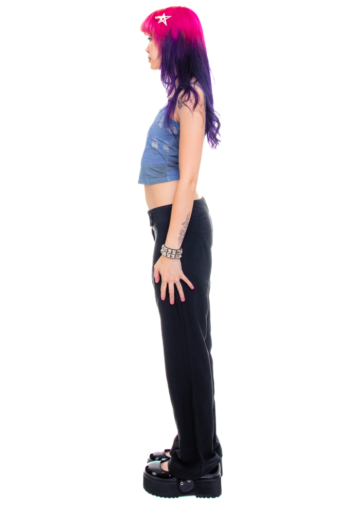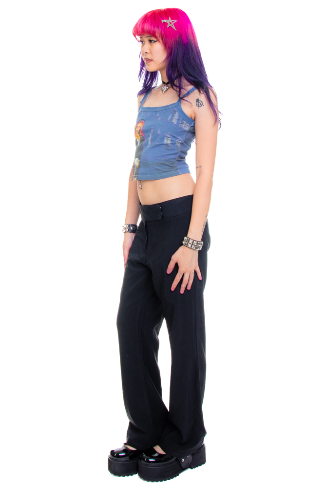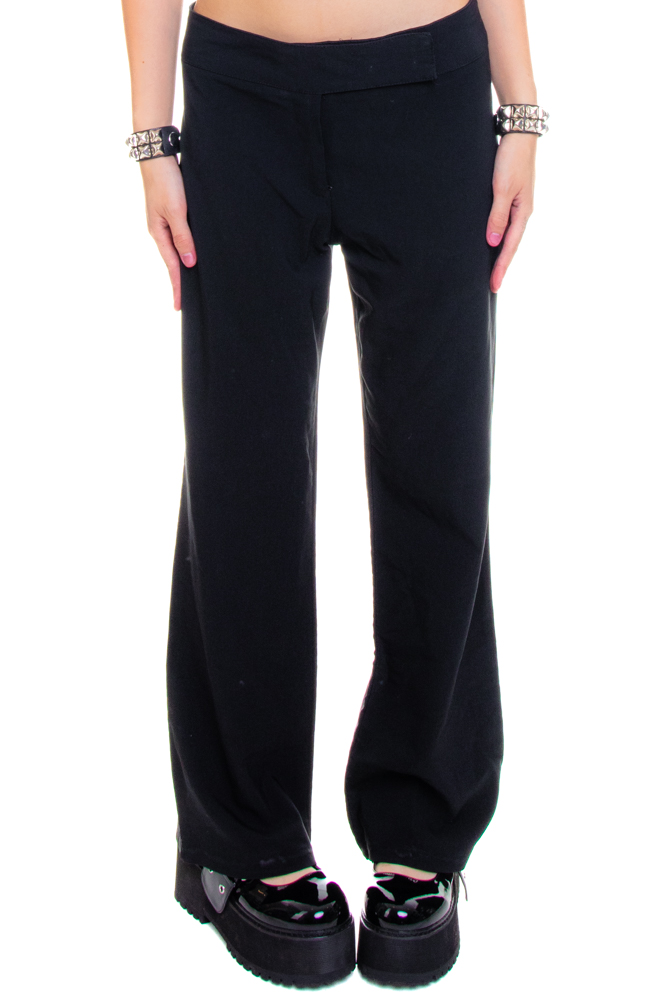 Vintage black relaxed-fit flares with wide waistband and crossover hook and eye closure!