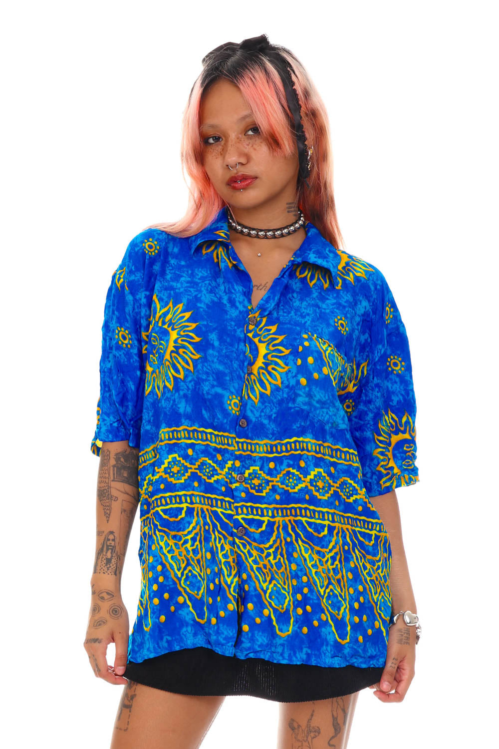 Oversized short-sleeved button-front shirt in bright blue and yellow with sun print graphic all throughout!!!
