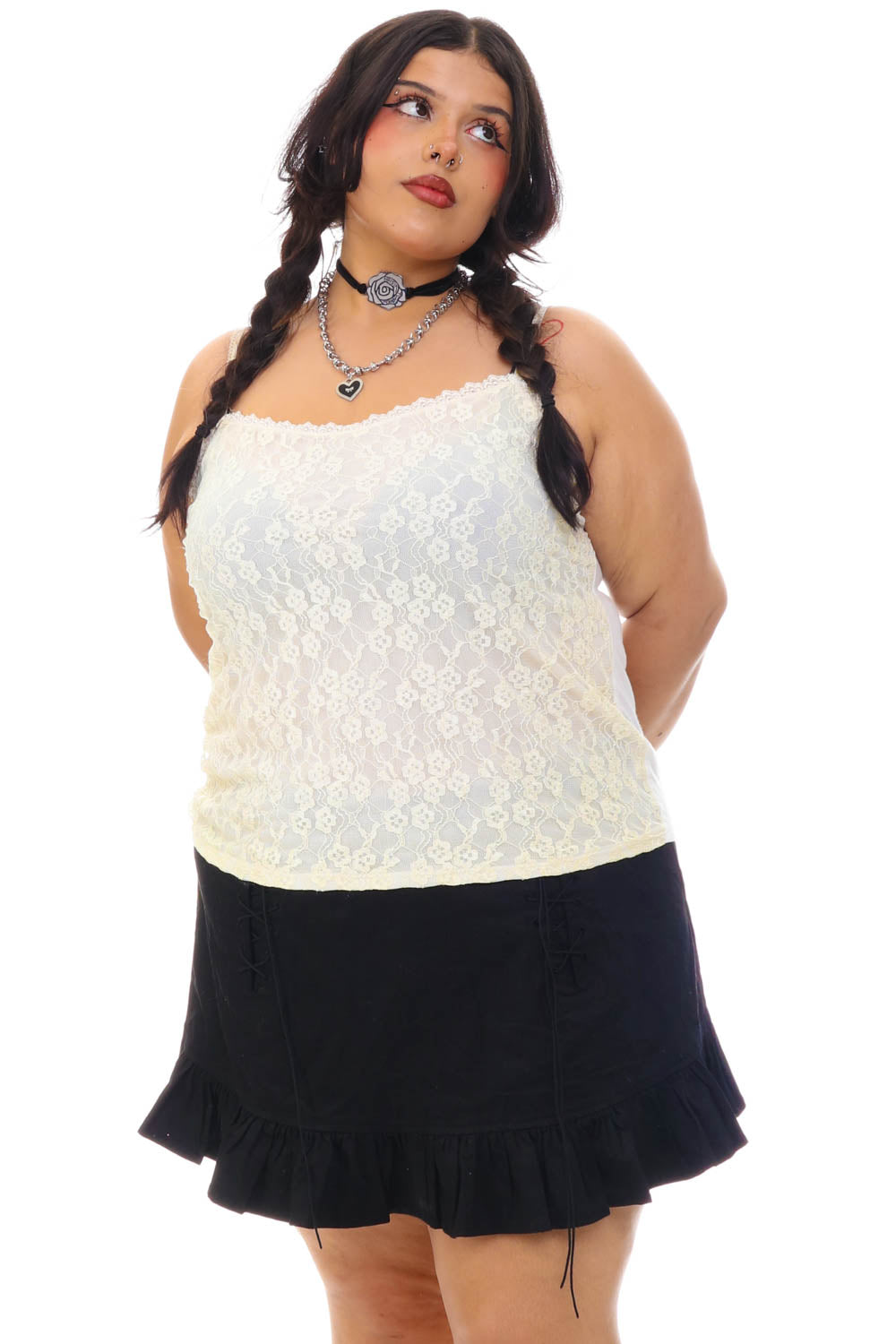 Vintage 90's white stretchy tank top with lace trim around bottom and thin adjustable straps!