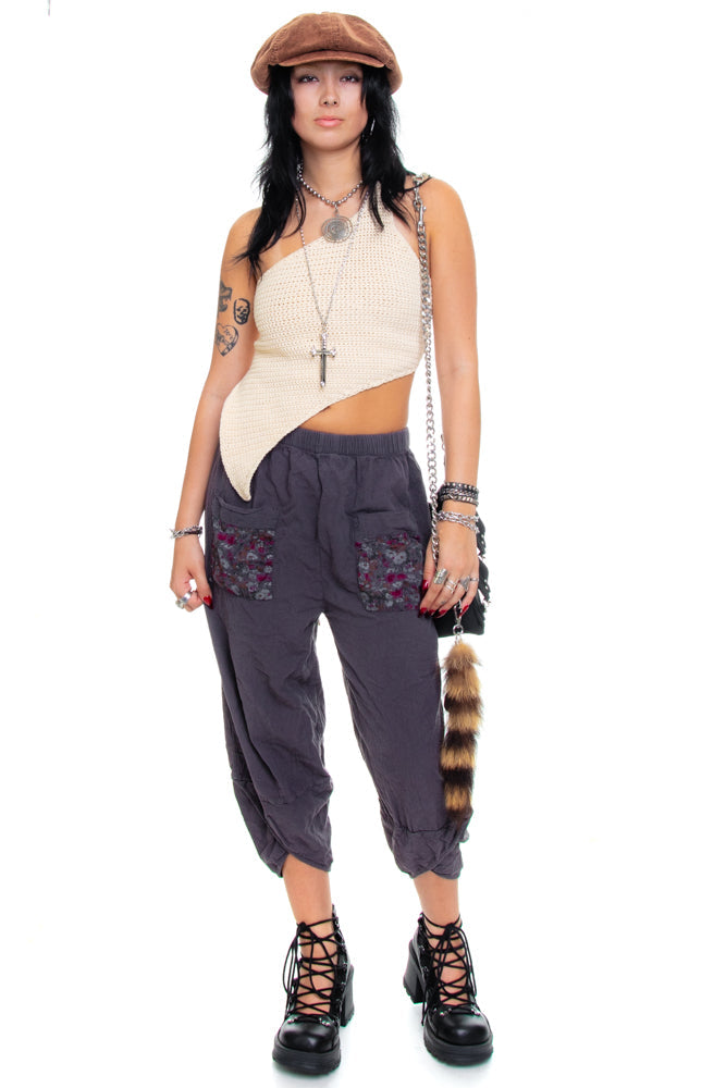 Charcoal grey pants with elastic waist and cropped fit! Floral patchwork pockets at front.