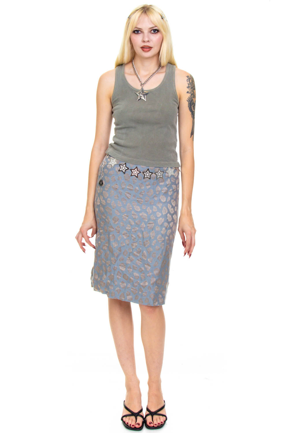 Vintage 90's beautiful faded blue midi skirt with allover shiny metallic leopard print with back zip closure!!
