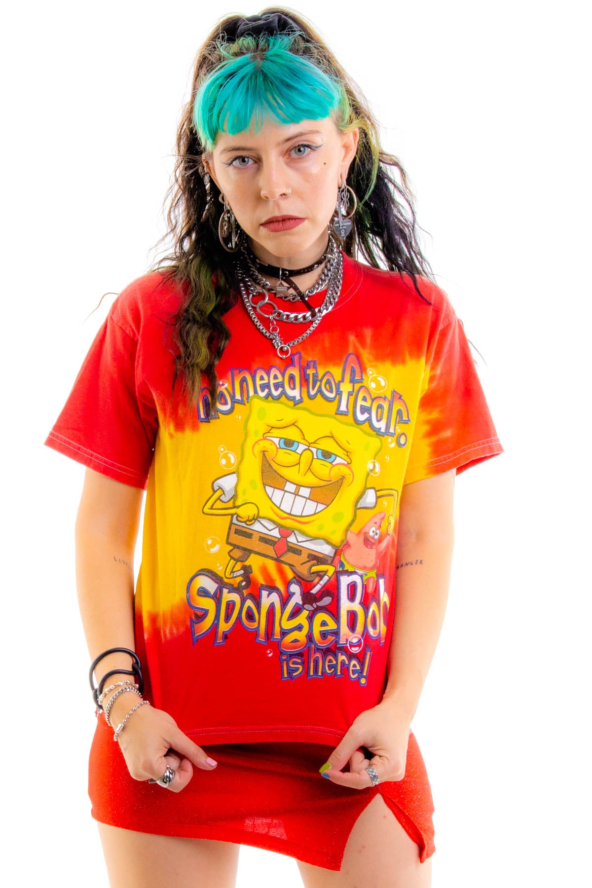 2002 y2k dreams Spongebob Squarepants t-shirt in red and yellow tie dye!! Super cute full graphic on the front featuring SpongeBob and Patrick! Reads " No need to fear. Spongebob is here!"