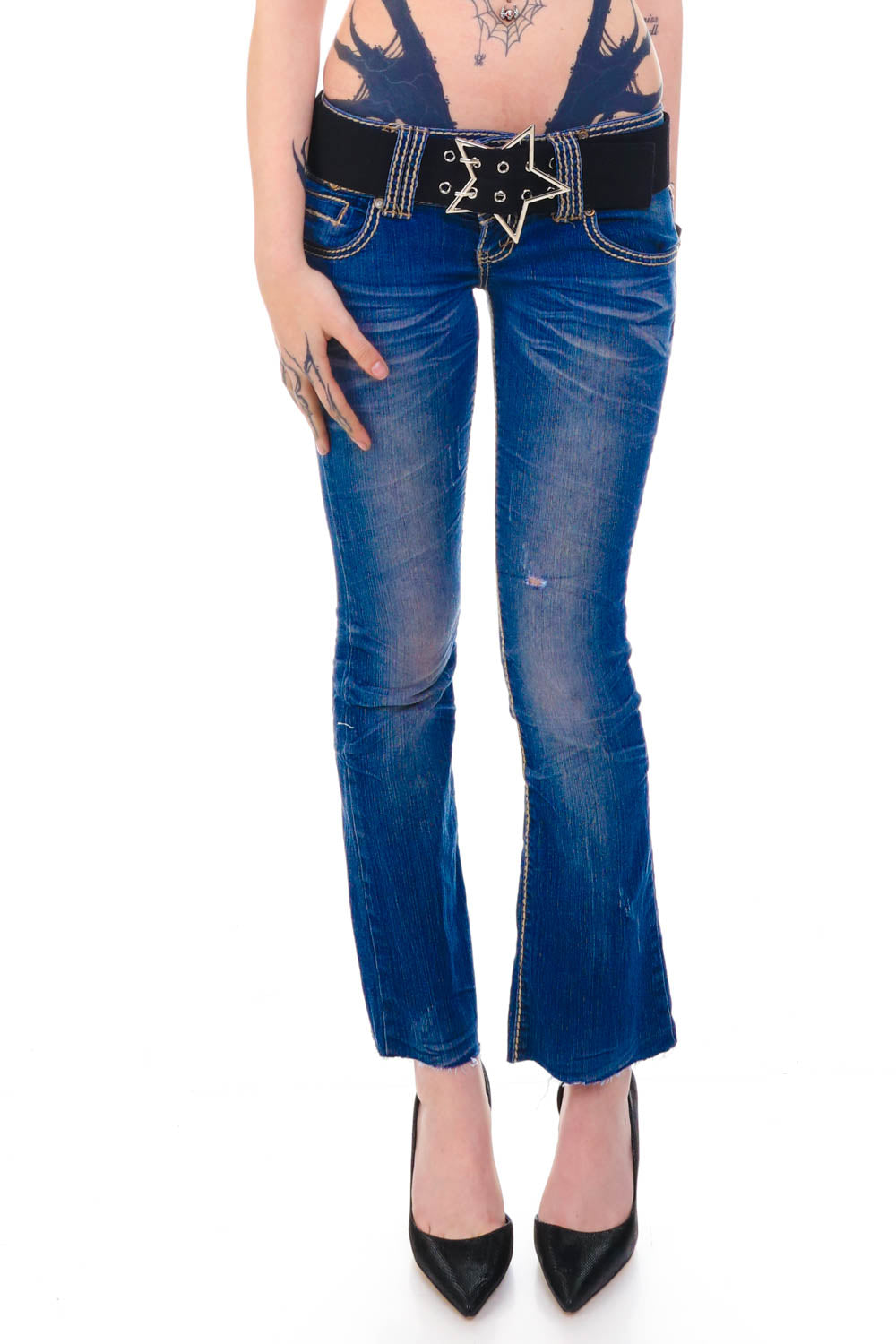 Vintage Y2K awesome medium denim wash low rise flares with contrast stitching and burnout with front button and zipper closure with front and back pockets!!