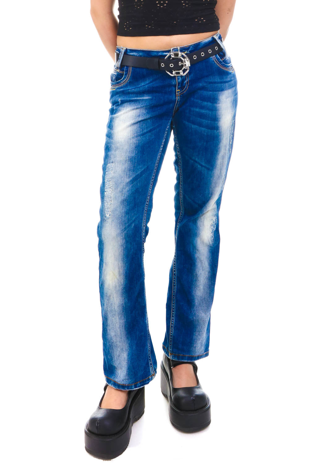 Vintage Y2K denim medium wash low rise with front button zipper closure and pockets and burnout details on front and back of denim pants!