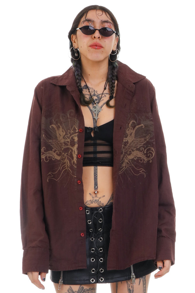 Super sick vintage Y2K shirt in light and dark brown with front button closure and collar with cool decorated skull graphic all throughout 100% Cotton!