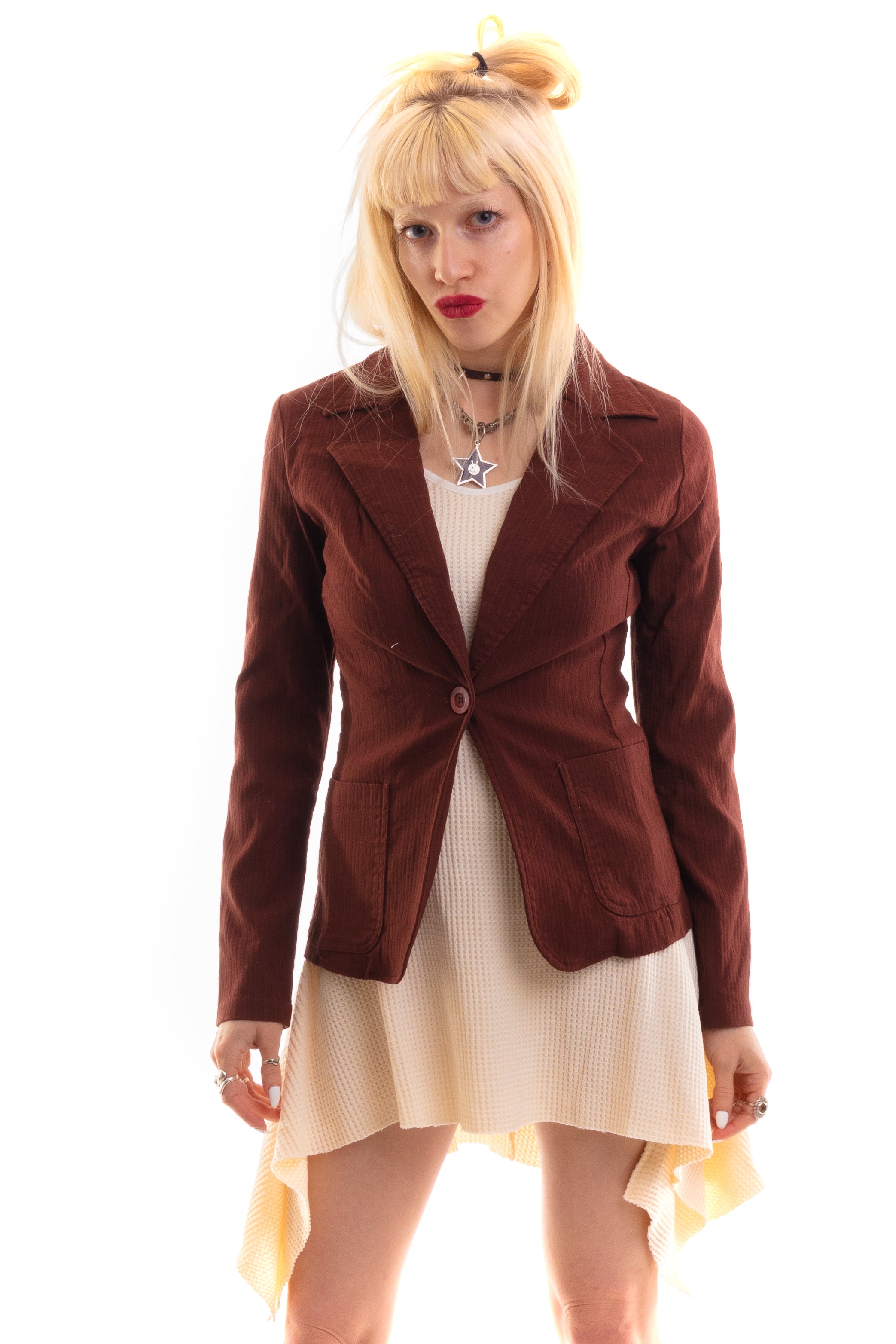 Vintage Y2K brown form fitting stretchy blaze with one front button closure and front pockets!