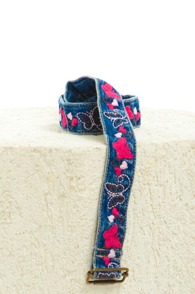 Medium wash denim belt with butterflies and heart embroidered in pink and white.