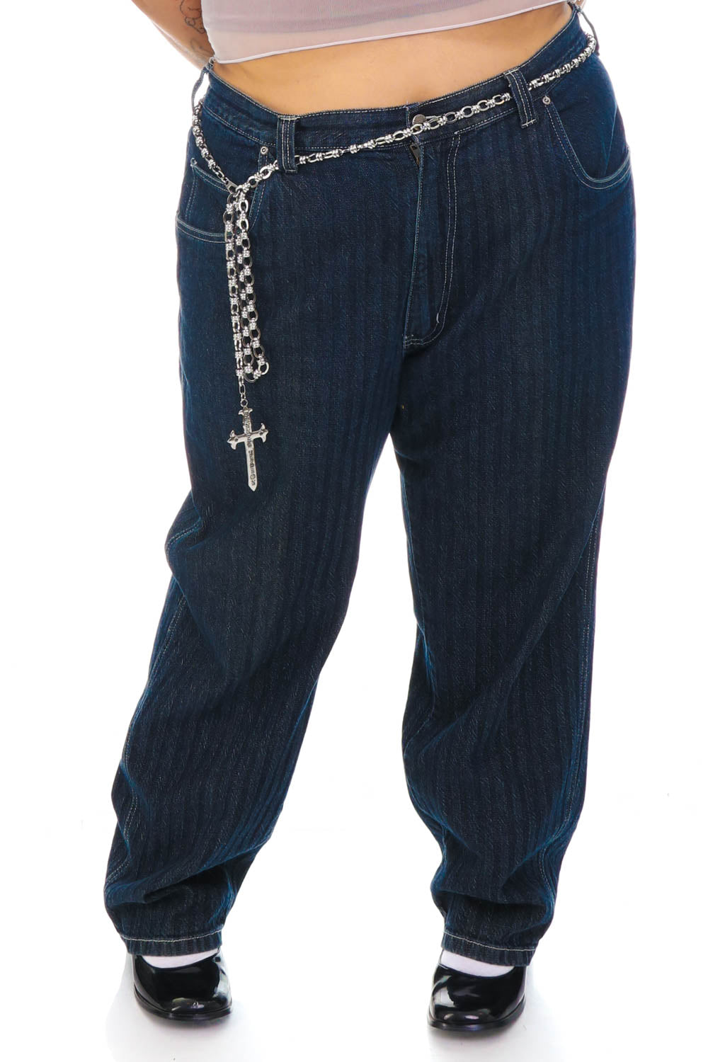 Vintage Y2K faded blue dark denim wash jeans! High waisted and slightly tapered at the ankle!! Such a cute fit! Has a pinstripe print throughout!