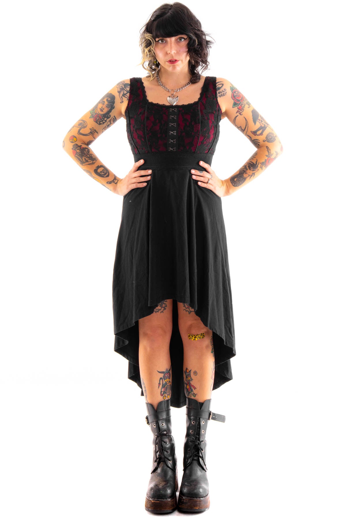 Very vampy Y2K royal bones vampy dress with a red bodice with black lace overlay adjustable straps and front eyelet closure detail and back zipper closure with a black high low skirt!!
