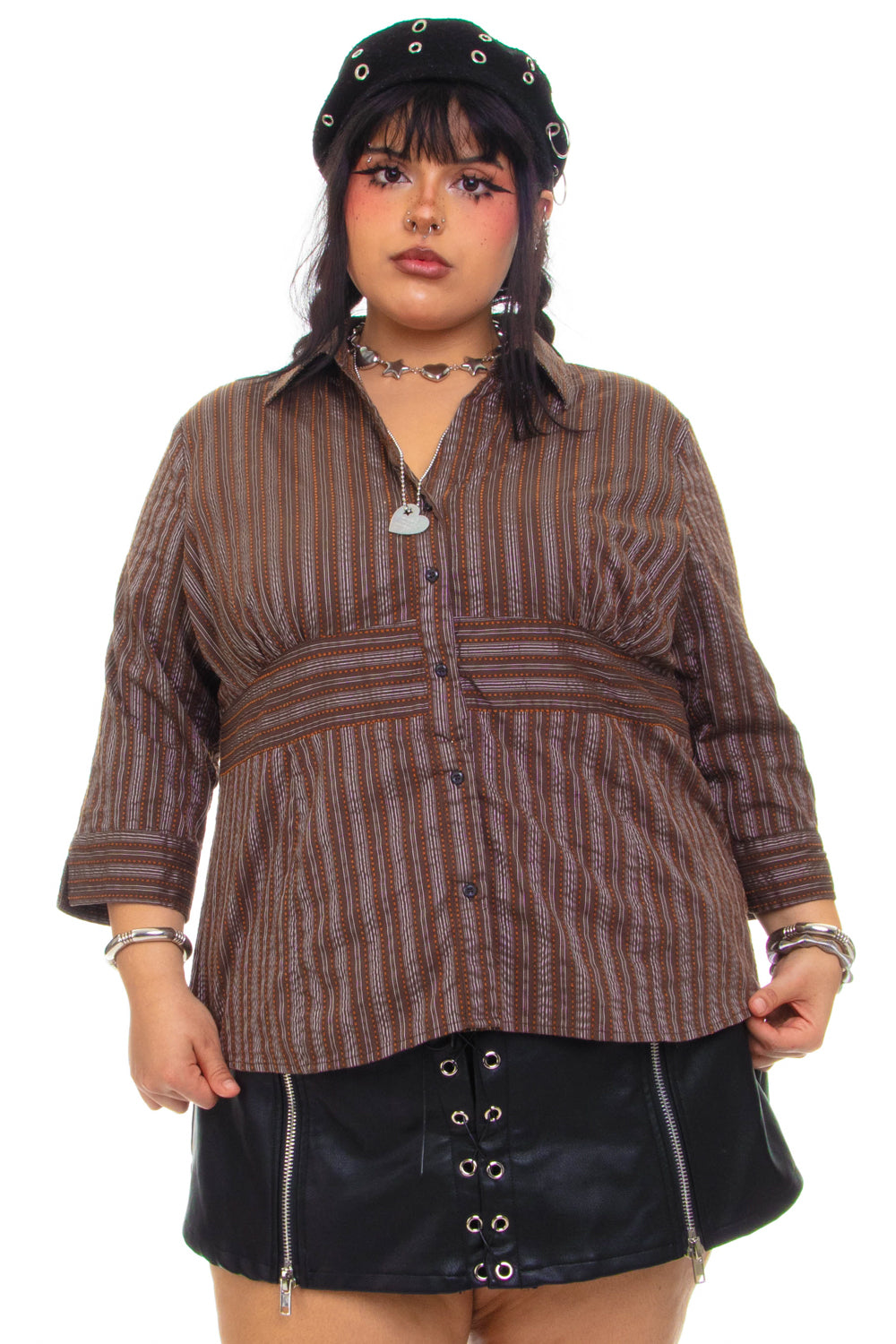 Super adorable Y2K stretchy long-sleeve blouse button up top with stripe dotted pattern!