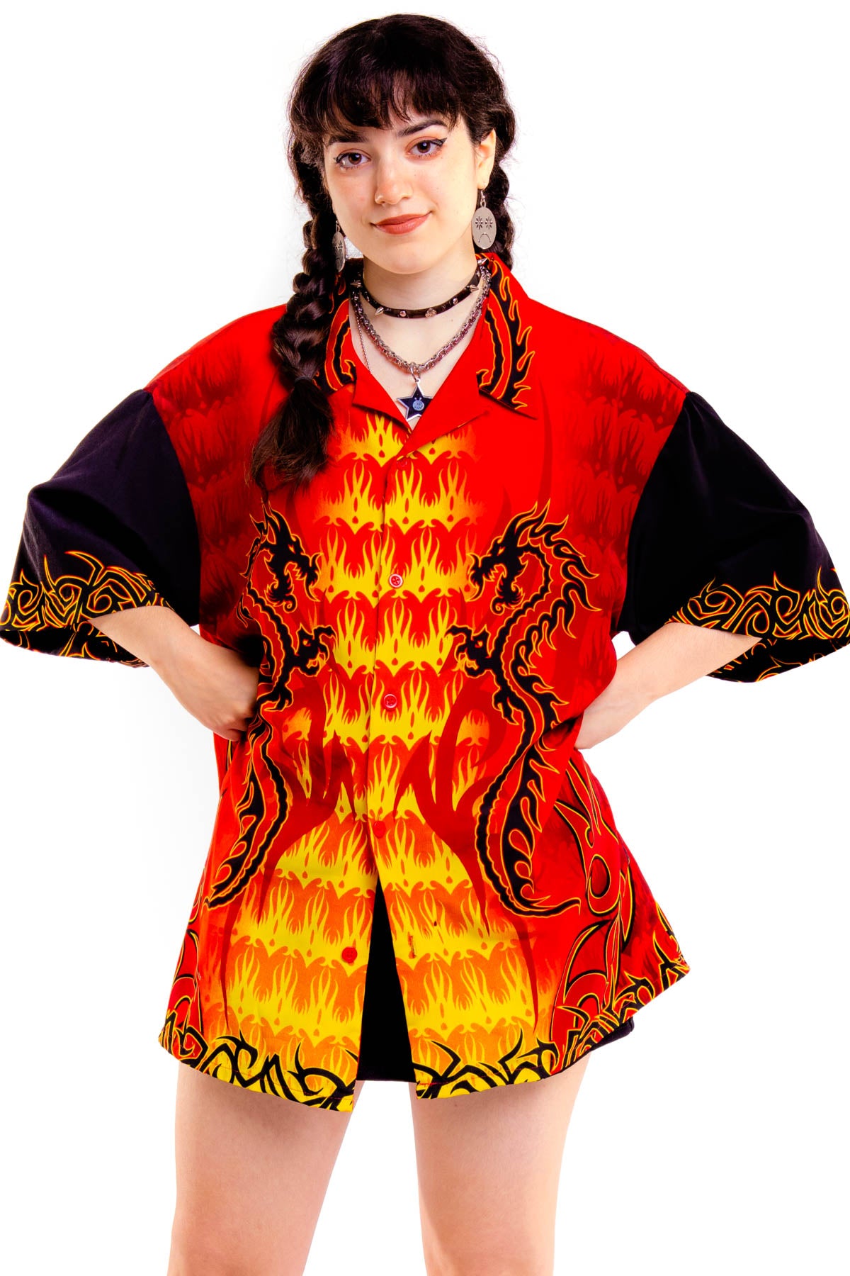 Vintage Y2K Tattoo Dragon Flame Button-Up