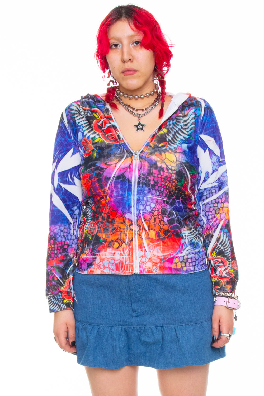 Vintage Y2K Tattoo Print Velour Zip Up Sweater