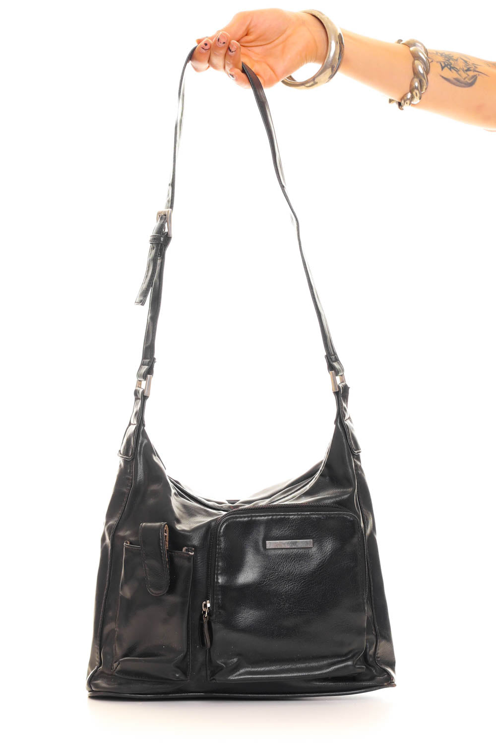 Vintage Y2K black leather shoulder bag with lots and lots of pockets and silver hardware!